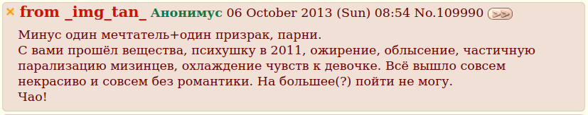 погуглил, ничего кроме пары поверхностных тредов не нашел, если кто знает скажите че с ним, очень уж интересно стало), а вообще осуждаю такое наркоманство, но расписал ахуенно, за душу история взяла