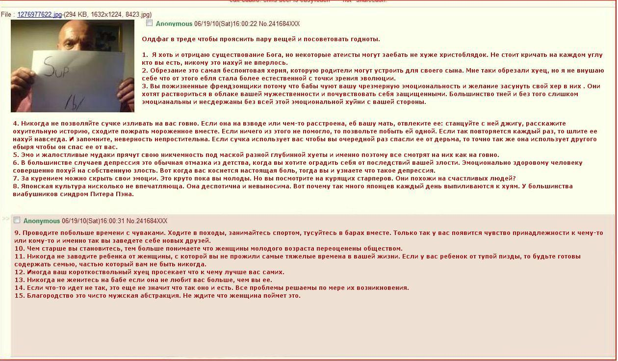 >>122580 >А че делать Слишком абстрактно. Я лучше на конкретику поотвечаю. Я и так простыни катаю - анон обычно кроет хуями за такое - а тут ты мне предлагаешь целую нить философских измышлений начать. Это на отдельный тред потянет.