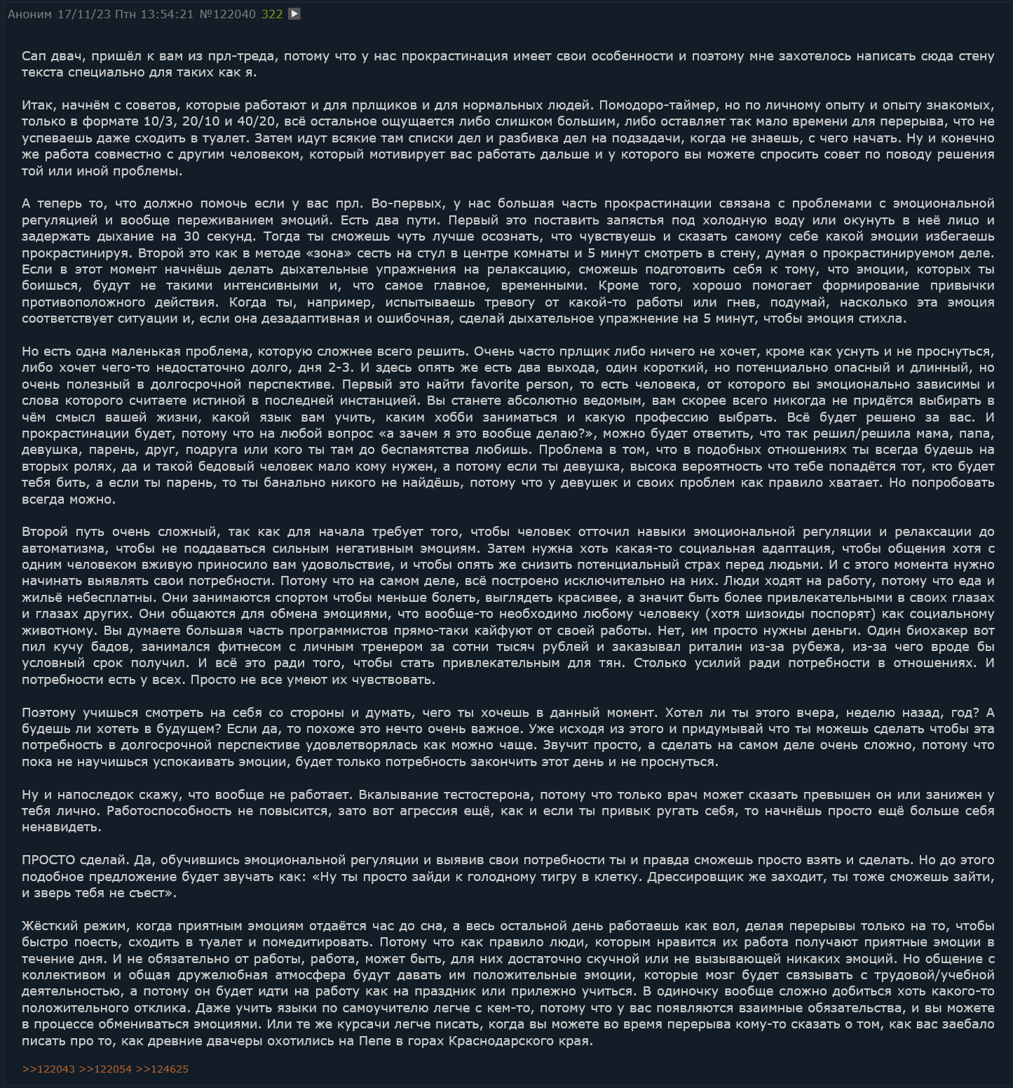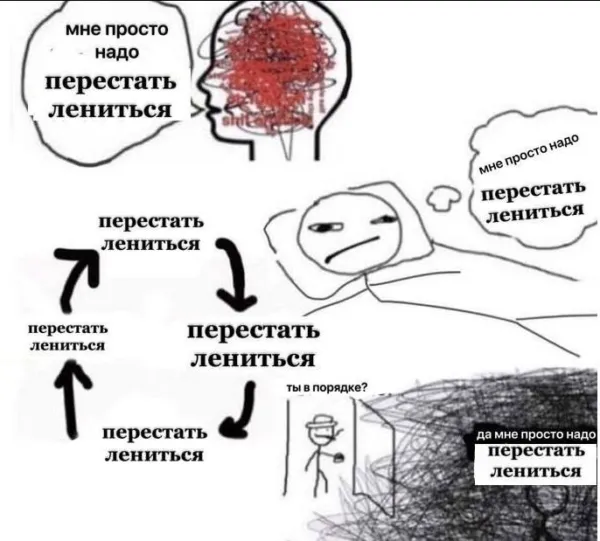 Перекачу слегка допиленную пасту из прошлого (>>120156 (OP)) треда Отрезвляющий пост из серии just do it. Подобное не раз встречал, но либо слишком сжатое и неотесанное, либо с чрезмерно агрессивным тоном и налетом «не будь тряпкой», и постарался разложить максимально нейтрально, логично и доступно, при этом без воды, изначально для себя. В теме проварился 10 лет, многие из которых по инерции, уже с полным осознанием, что это та же самая прокрастинация, с которой как бы и борюсь.