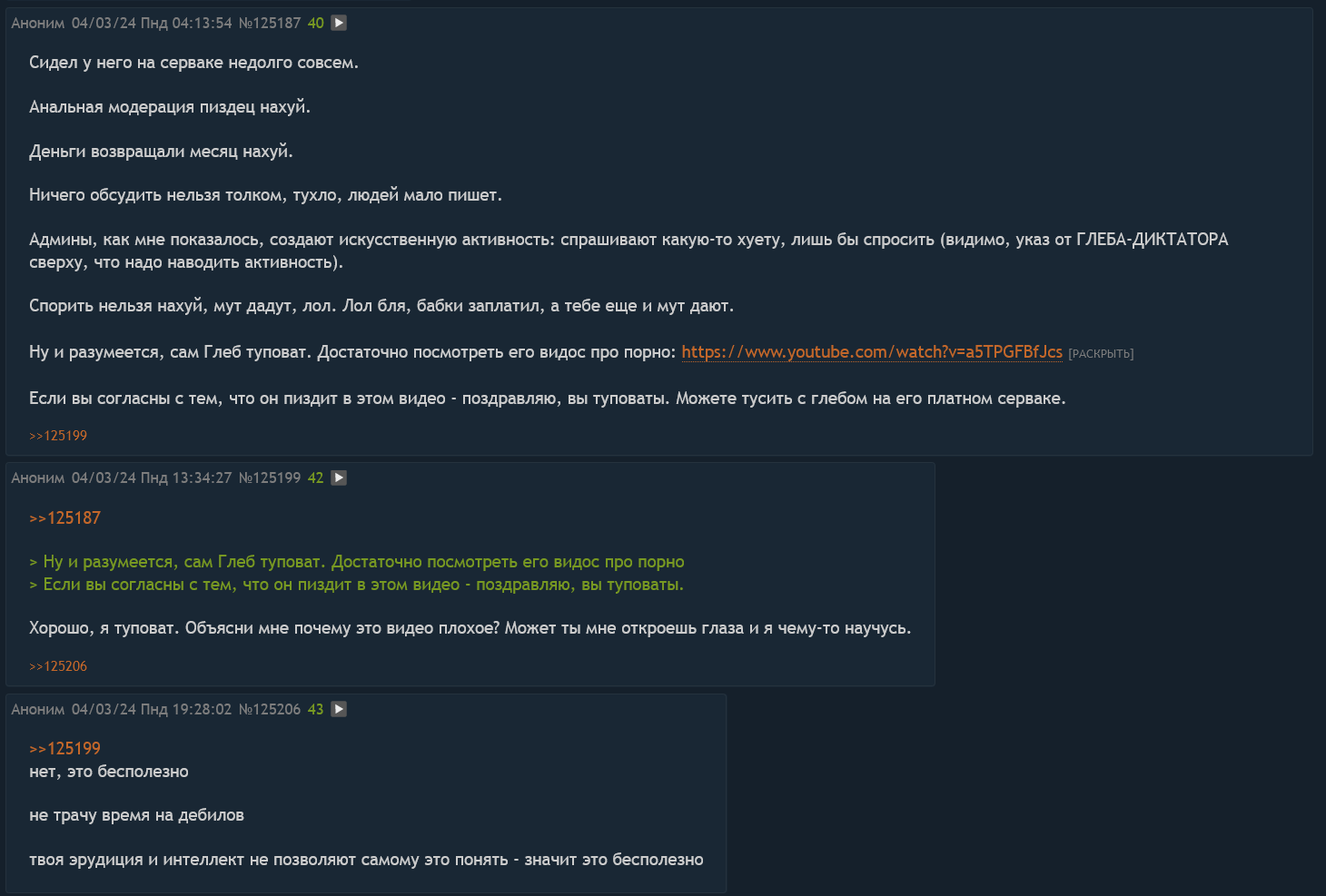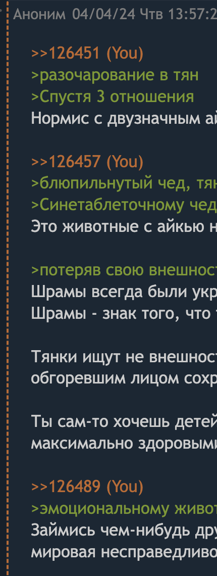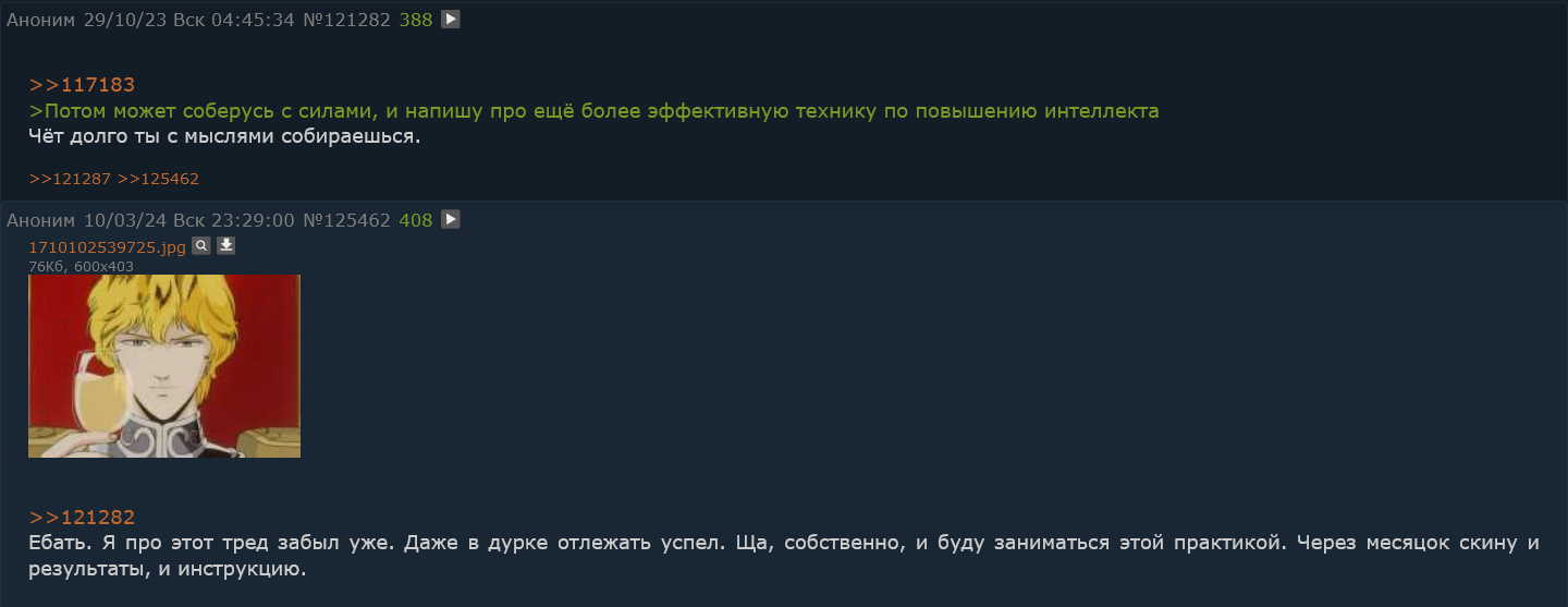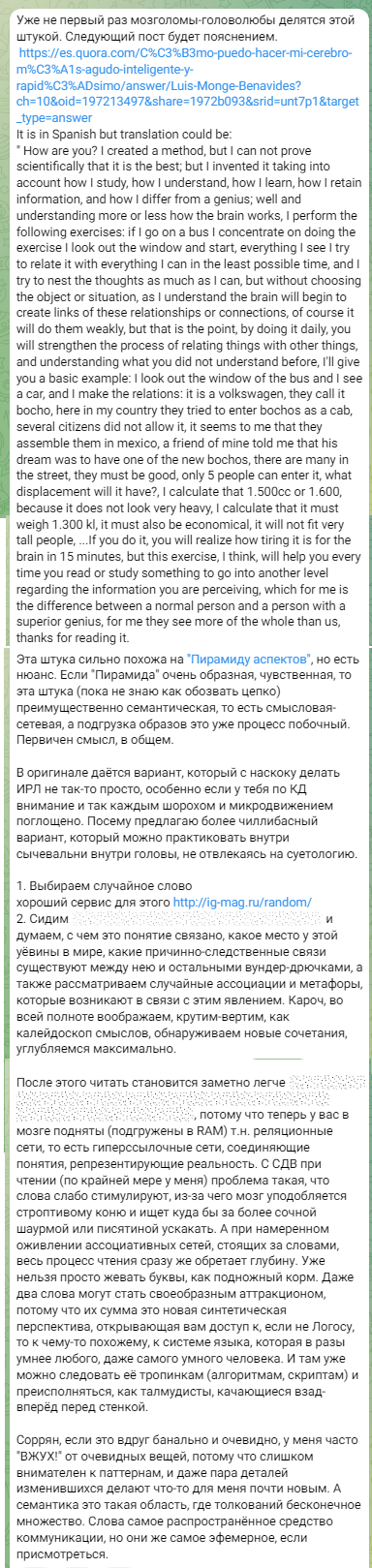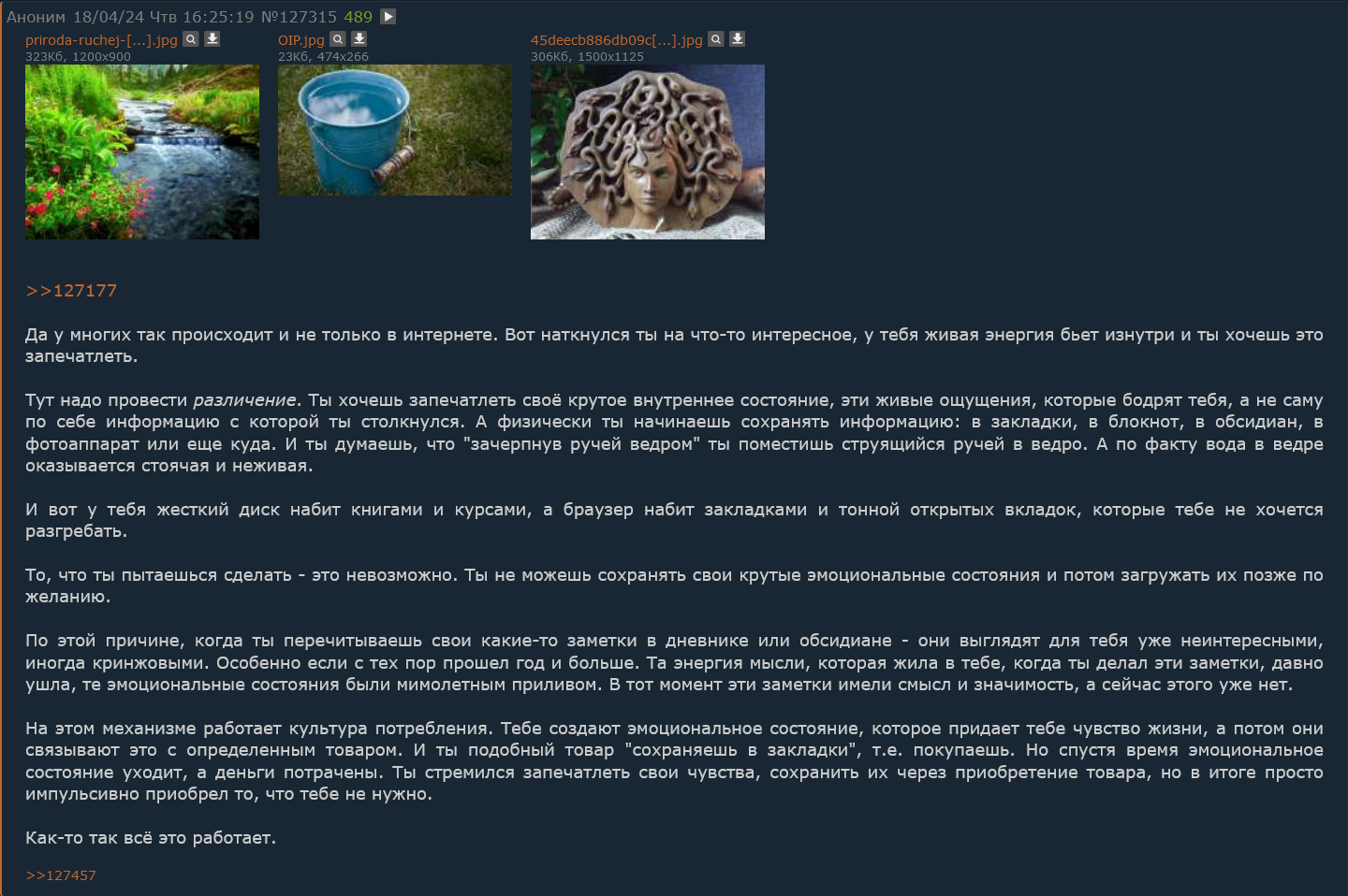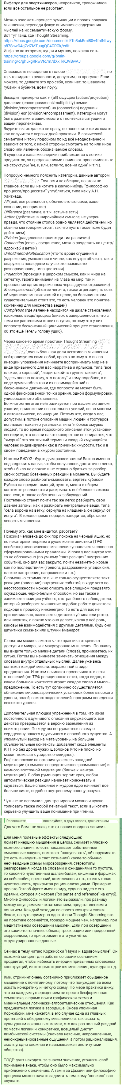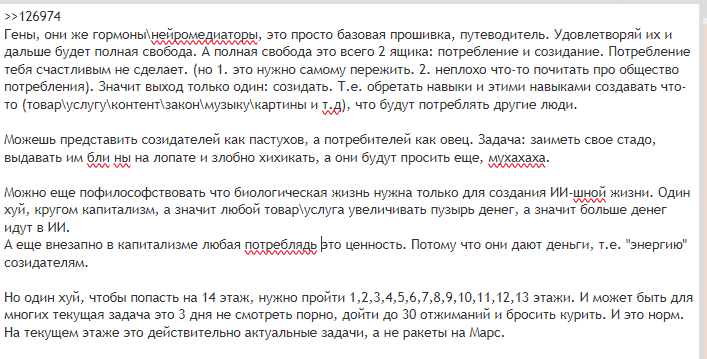 Я полагаю, шизом вы тут чела прозвали из-за излишней активности и, возможно, какой-то догматичности. Не знаю, зачем он столько строчит (я сам уже нормально так настрочил, кек-кхе). Может, типа себя самого посильнее индоктринировать хочет или просто мысли излить, но и в его писанание можно что-то здравое для себя найти. Хотя, как я уже упоминал, чужие формулы не работают сами по себе, особенно если человек не инструменты ищет и не проблему решить хочет, а завуалированно поныть и оправдать статус-кво.