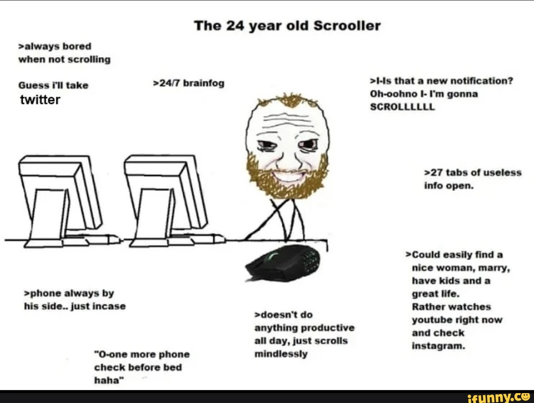 Естественно что человечество смекнуло, что можно тратить усилий меньше, а получать дофамина больше. Фап, алкоголь, болеть сидя в Колизее. Дальше пошел нейромаркетинг. Сайты получили бесконечный скроллинг. Суть новостей - генерация эмоций, а не поставка информации. Клиповое мышление, потому что новизна это дофамин, значит нужно больше новизны, значит ролики по 5-10 секунд и т.д.
