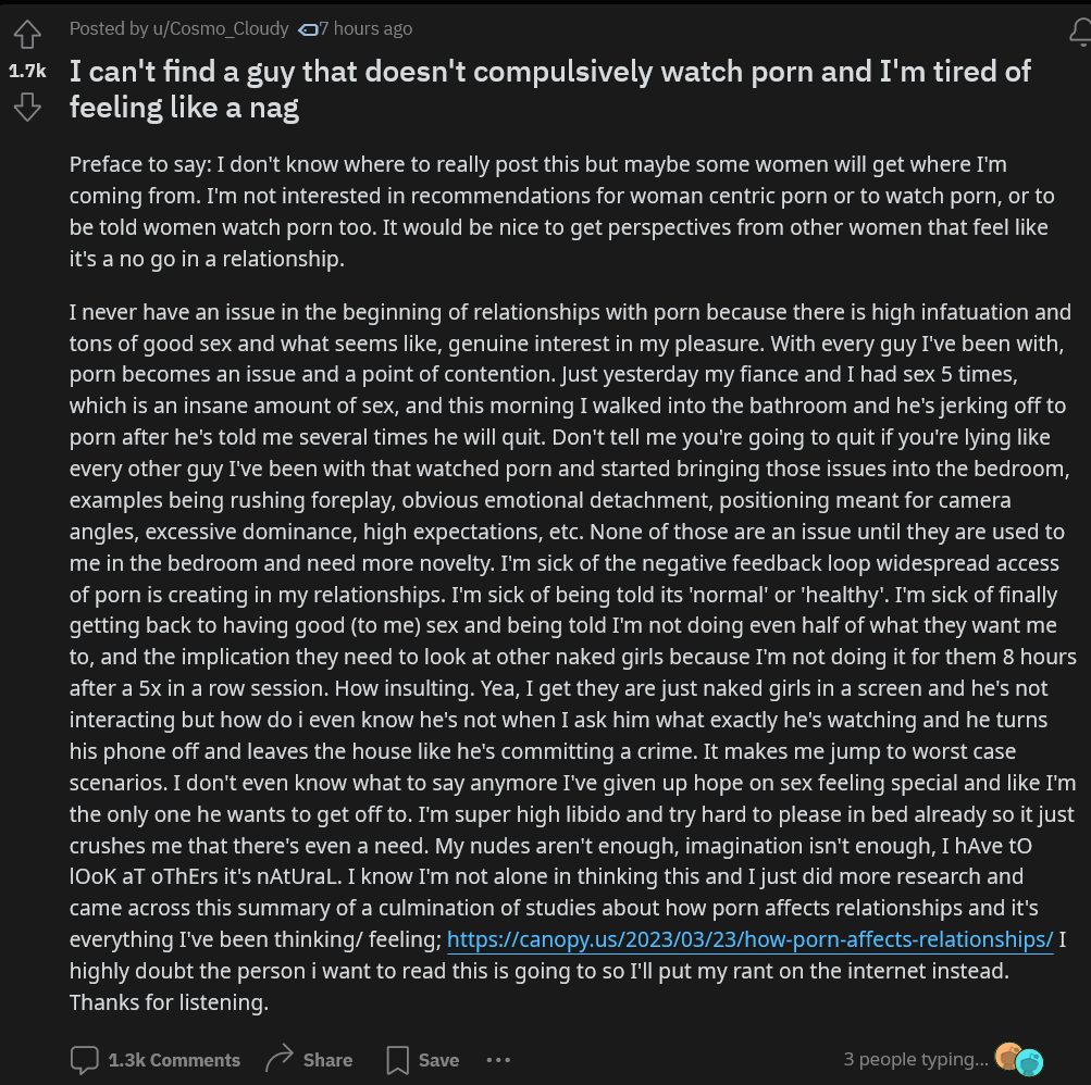 >Во первых не сможешь так часто Да я и рукой редко дрочу. А тян будет постоянно домогаться до тебя с сексом, если живёте вместе. А если ты её не удовлетворяешь - будет изменять. >во вторых эмоциональная подпитка, что хорошо сказывается на психике Люди вызывают тревогу и отторжение. Особенно если требуется доверять им своё тело. Я свой член точно не сломаю, т.к. непосредственно ощущаю. К тому же неизбежны мысли "вдруг она изменяет?" и потенциальный риск заражения ЗППП. >а в третьих отвыкаешь от порно У меня нет зависимости от порно, мне его вообще противно смотреть - там уродливые голые люди. Ты бы стал дрочить на видео о спаривании свиней? >и от перспективы наблюдателя Есть очень много контента "от первого лица", если тебя это настолько сильно волнует, что ты отдельно об этом упомянул (комплексуешь поди?).