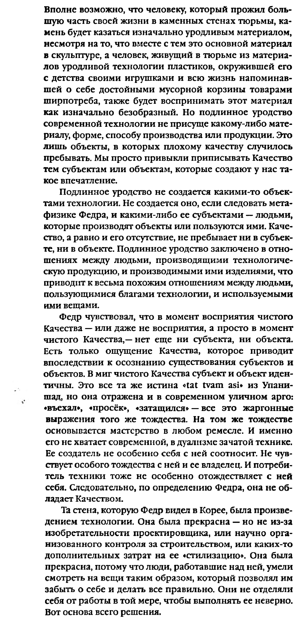 > Итак, работая с мотоциклом, как и в любом другом деле, нужно поддерживать свой душевный покой, и вы будете неотделимы от своего окружения. Когда это удается, все получается естественным образом. Спокойствие духа вырабатывает вернуло систему ценностей, верные ценности дают ход верным мыслям. Верные мысли приводят к правильным действиям, а правильные действия выливаются в работу, которая позволяет остальным увидеть в ней материальное отображение безмятежности — основы всего сущего.