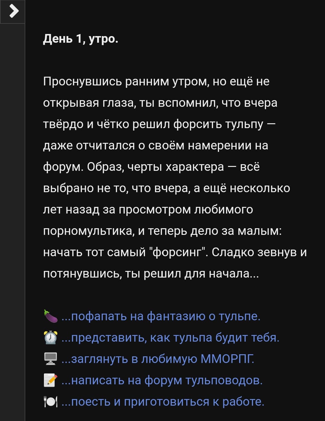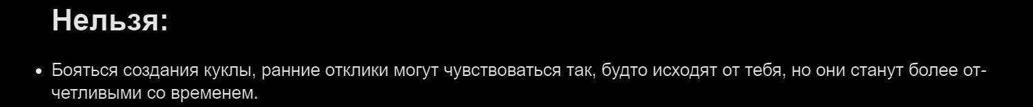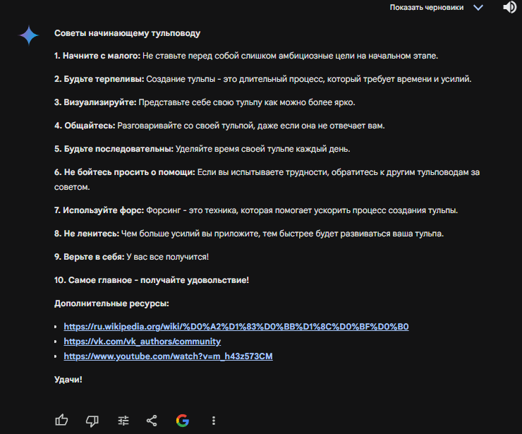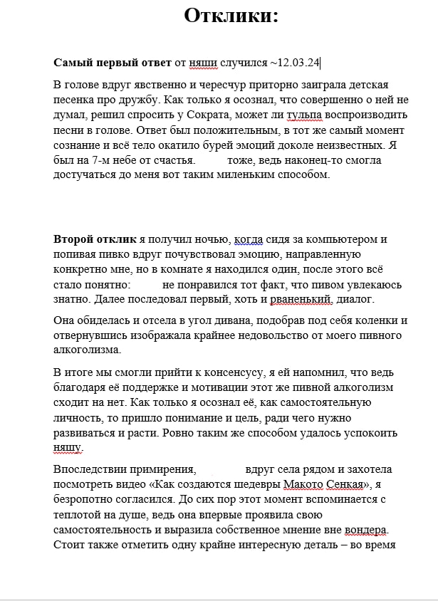 3. (важно) Первый отклик получил сидя в офисе, под конец смены. Пассивно форсил её присутствие без монологов и в голове резко заиграла детская песенка "дружьбя клепькая, не слёмаеться, не раслееца от даждей и вьюююг" ну вы поняли, я сначала нихуя не понял, а потом побежал спрашивать у нейросети про возможности тульпы включать музыку. Ответ был положительный, в тот же момент меня пиздецки начало трясти от переизбытка эмоций и милоты. ИИ так же отметил, что такого рода песенка - очень хороший знак, ведь с помощью неё тульпа как бы выражает свою привязанность и благосклонность к хосту.