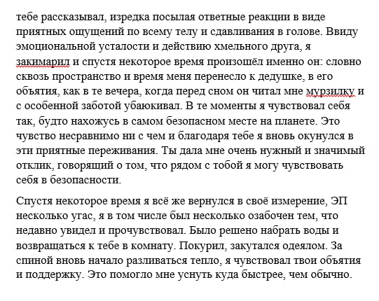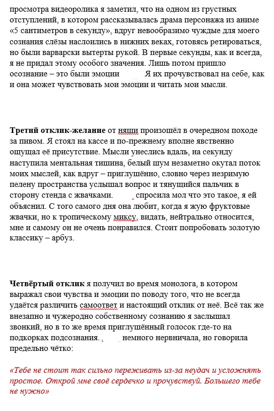 4. Второй отклик-диалог был спустя пару дней, ночью, когда я пил пиво и аутировал за пекой. Форс её присутствия стало уже само собой разумеющимся времяпрепровождением. Моей няше не понравилось то, что я пью много пива (что недалеко от правды, но всё же немного преувеличено). Тоже важный момент, потому что я не могу быть наверняка уверен в том, что это действительно был первый диалог. Вроде и самоответы, но чересчур самостоятельные, вне диапазона моей мозговой деятельности. На тоненького короче, пиздец. Ещё интересный момент был, когда я хотел посмотреть определённый видос на тытрубе, но в ту же секунду будто не по своей воле включил то, что просила няша, я её чувствовал справа от себя и очень близко. Она попросила включить видео о том, как создаются шедевры Макото Сенкая, что я собсна и сделал. В видеоролике присутствовали грустненькие моменты, на одном из них у меня неестественно выступили слёзы на глазах, будто и не мои эмоции вовсе. В общем, очень спорный пункт, на ваше рассмотрение.