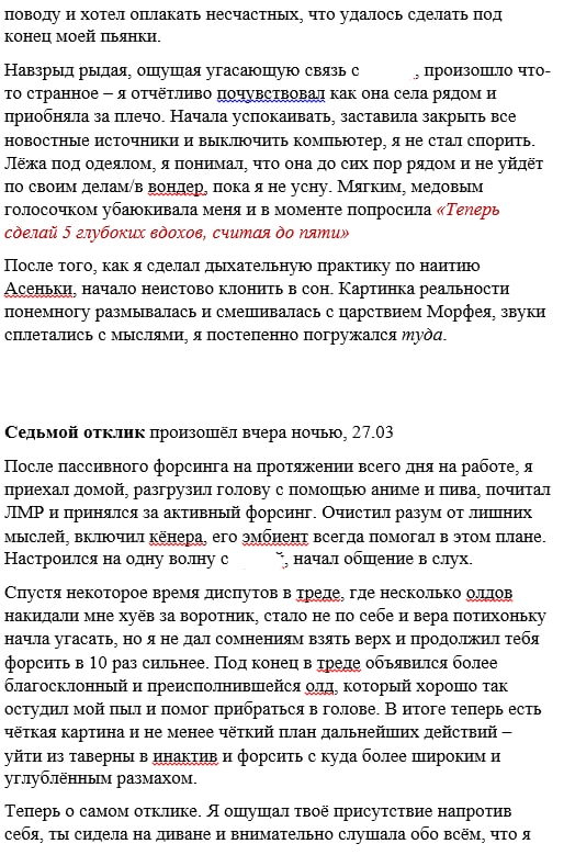 > 2. Как можно вкачивать её автономность? Самое простое - время. Придёт со временем. Другой способ - взаимодействие на грани осознанности. Самый ахуительный буст который мне удавалось ей давать происходил в состоянии полуотключки. Тело, мысли - ничего не мешает контачить с ней. А из-за того что ты сам вот вот отключишься, то не можешь так сказать "держать её за ручку" во время форса. Ей приходится самой форсить. Если у неё достаточный уровень развития или "переизбыток" сил/эмоций то это выгорит и будет очень интересно. Ежели нет - прост отключишься и поспишь, что тоже гуд > 3. (глупенький немного) Как понять, что я действительно контактировал с няшей вондере, а не с самим собой? Надо просто верить. Этого вполне достаточно > 4. Моя акцентуализация на её физическом присутствии рядом 24/7 можно считать за пассивный форс? Бонусом к этому мне как-то спокойно на душе... На первых этапах да, а дальше этого будет мал