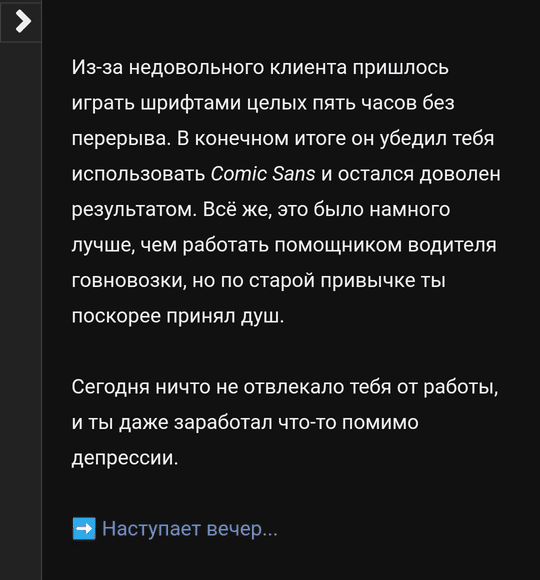 >>126854 >тебя будет подгонять индикатор "воли к жизни", после истощения которого гг выходит в окно. Это хорошая концовка: герой выходит из окна на первом этаже, щупает траву и плачет от радости. Достижение даёт клещей и +69 к силе тульпы.