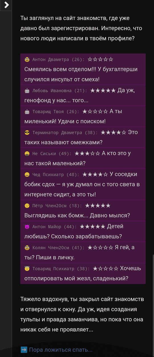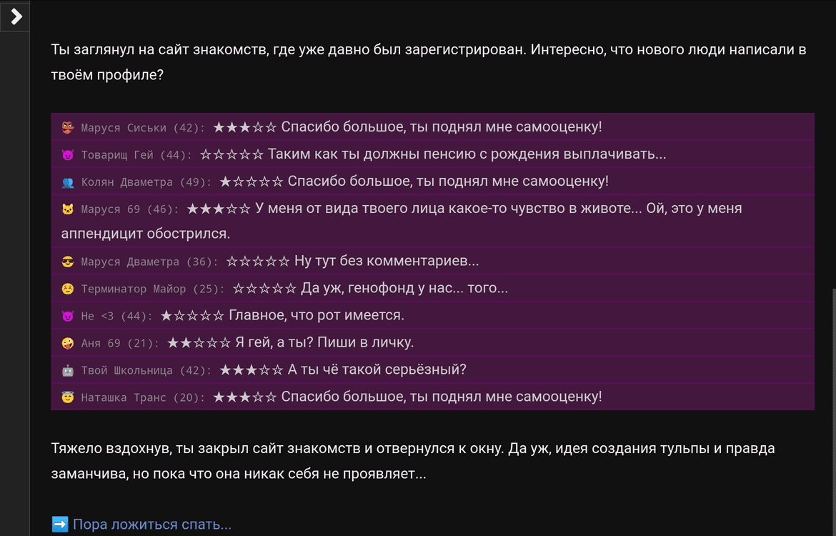 >>126944 Совсем расфантазировался... Люблю воображать, насколько неадекватно работает мыслительный процесс у людей, которые начинают нести хуйню по типу "о, ко мне какая-то тульпа пришла, полагаю, выбора нет, придётся форсить..." Это как представить себе тульповода со "статами" из фолаута типа "воображение: 9, самокритика: 1, смекалка: 1" и моделировать, чего такой человек способен себе навоображать за год форсинга. Лицо тульпы при этом представлять не берусь, страшно.