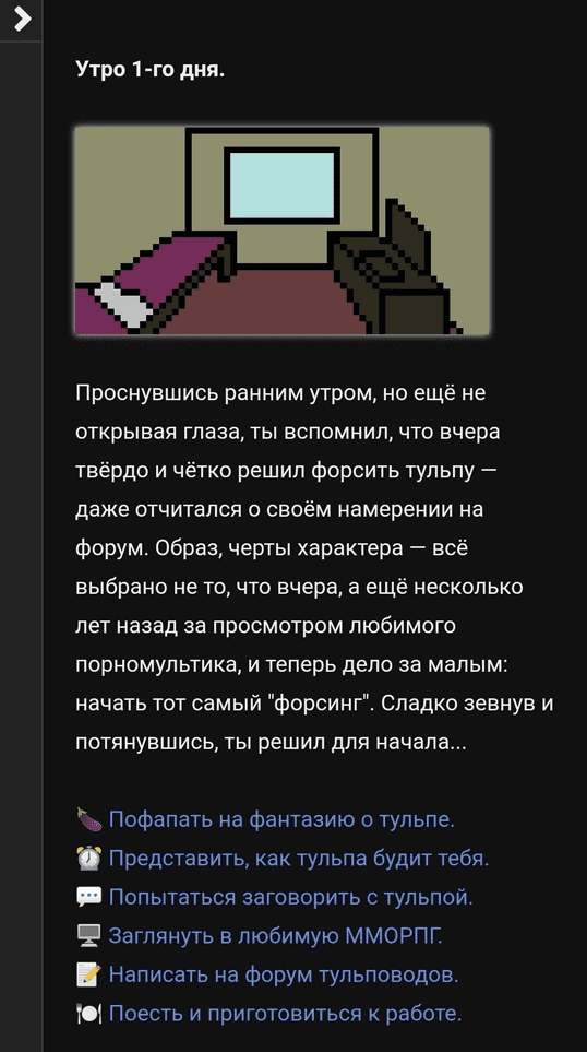 >>126851 (OP) На пике должно быть созвездие Роммеля... >>126853 Каждому не угодишь, важные детали у каждого тульповода свои. ГГ должен быть кто-то на подобии Немикии, или Кладовки. И что-бы игра не длилась вечно, тебя будет подгонять индикатор "воли к жизни", после истощения которого гг выходит в окно.
