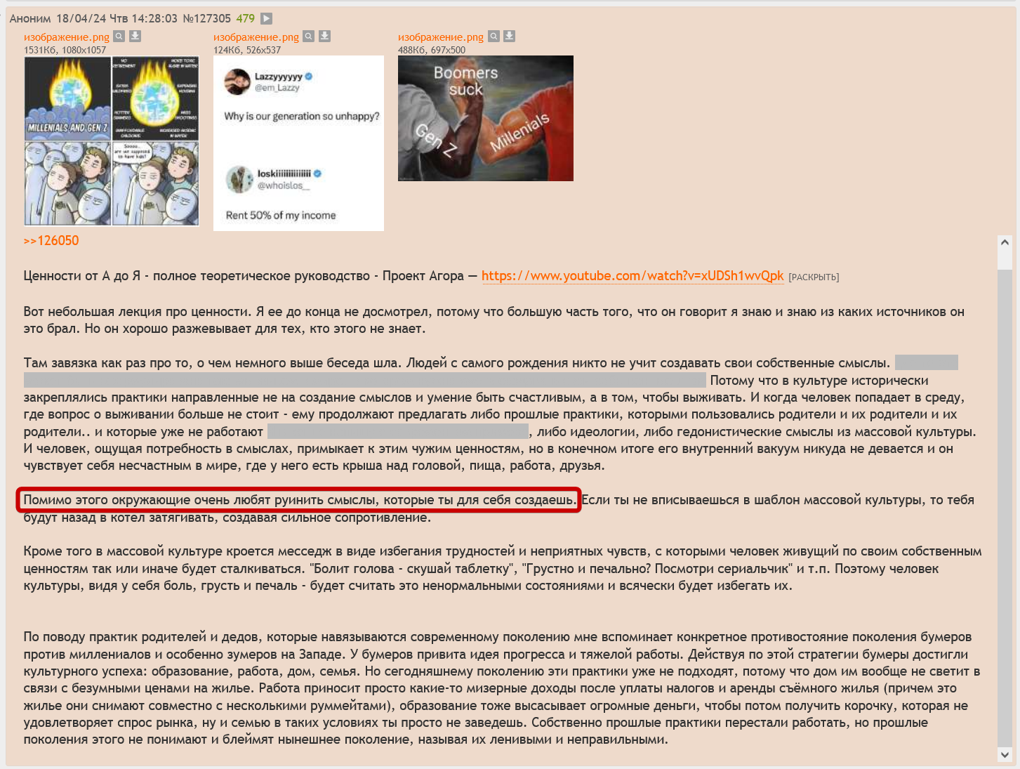 >>126886 Ты заебал со своим абсолютизмом. Согласно тому, что ты пишешь, и суицидникам не надо помогать в моменте — всё равно когда-нибудь выпилятся. И проблемных людей воспитывать не надо — всё равно такими останутся. Name it, у тебя просто каждый человек на планете повязан нитью своей судьбы, которую не разорвать вообще никак и ничем, разве что топором в голову. Просто не люди, а какие-то персонажи. Стартовые характеристики: где родился, кто родители, какой характер залутал, где вырос, плюс мелочи типа щемили одноклассники или не щемили и т.п. Из этого всего вытекает: способен человек зафорсить или нет, способен он чему-то обучиться или нет, будет он что-то делать или не будет. До подросткового возраста жил "неправильно" — значит всё, тульпу никогда не зафорсишь, даже не пытайся. Просто пошёл нахуй, возомнил о себе как будто всё про жизнь и про людей знаешь и обязательно надо сидеть и с надменным лицом учить рандомов из интернета как жить. Тебе миллион раз говорили: у людей могут быть проблемы, которые не дают им зафорсить сегодня, но через пару лет они пропадут и человек форсить сможет. Уж не говоря о том, что человек и без того каждые несколько лет меняется — тот, кому тульпа не нужна, мог "дорасти" до того состояния, в котором тульпа внезапно оказывается лучшим вариантом. Как и наоборот. Нехуй топить всех ньюфагов, которых ты лично считаешь неправильными, им надо прививать старательность чтобы у них были силы пережить чёрные полосы в жизни и чтобы тульпа банально дожила до того момента, когда хост сможет начать уделять ей достаточно внимания.