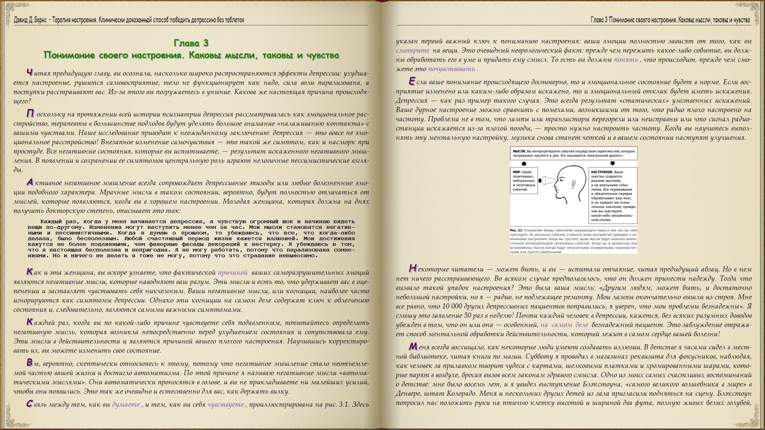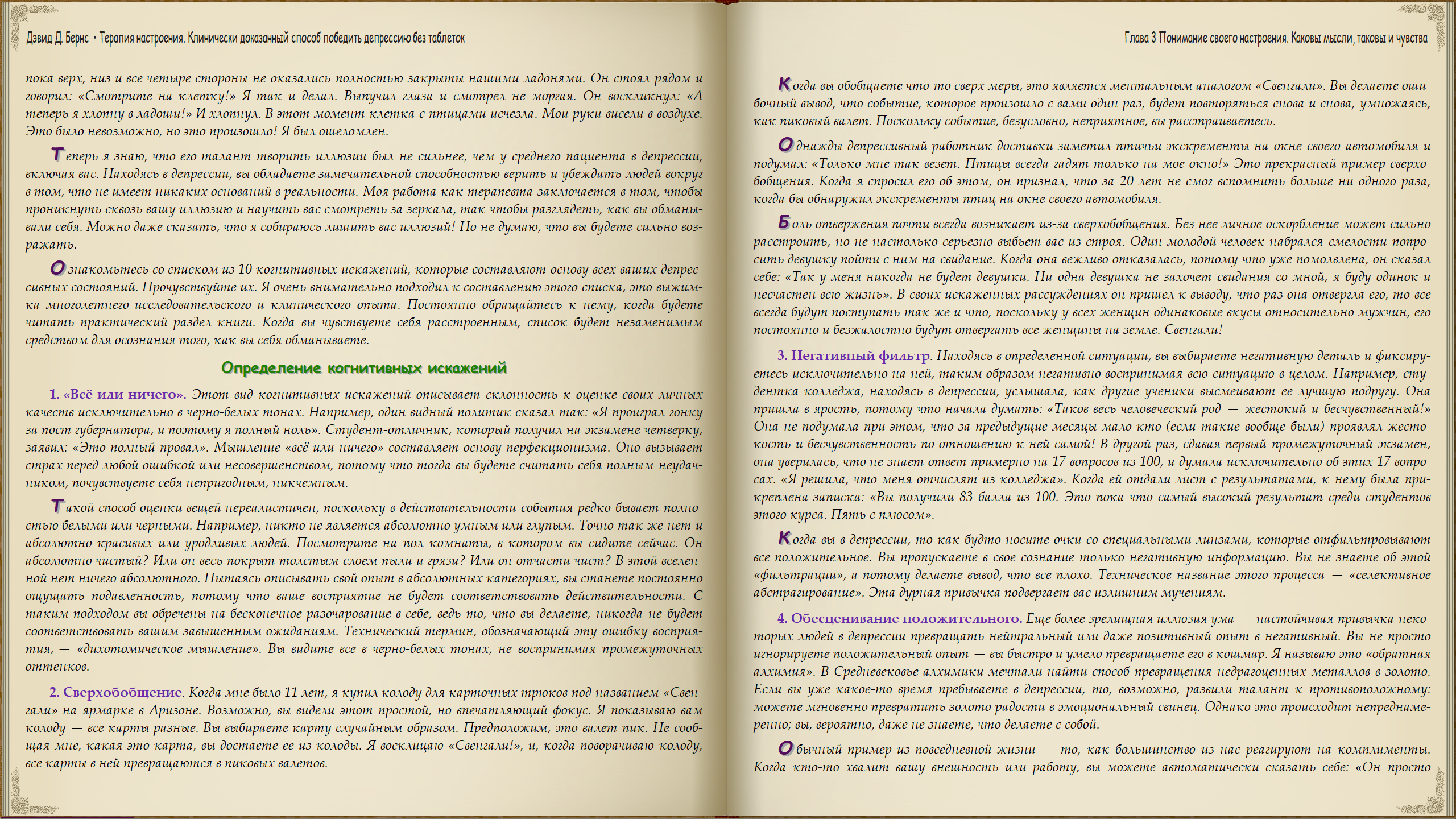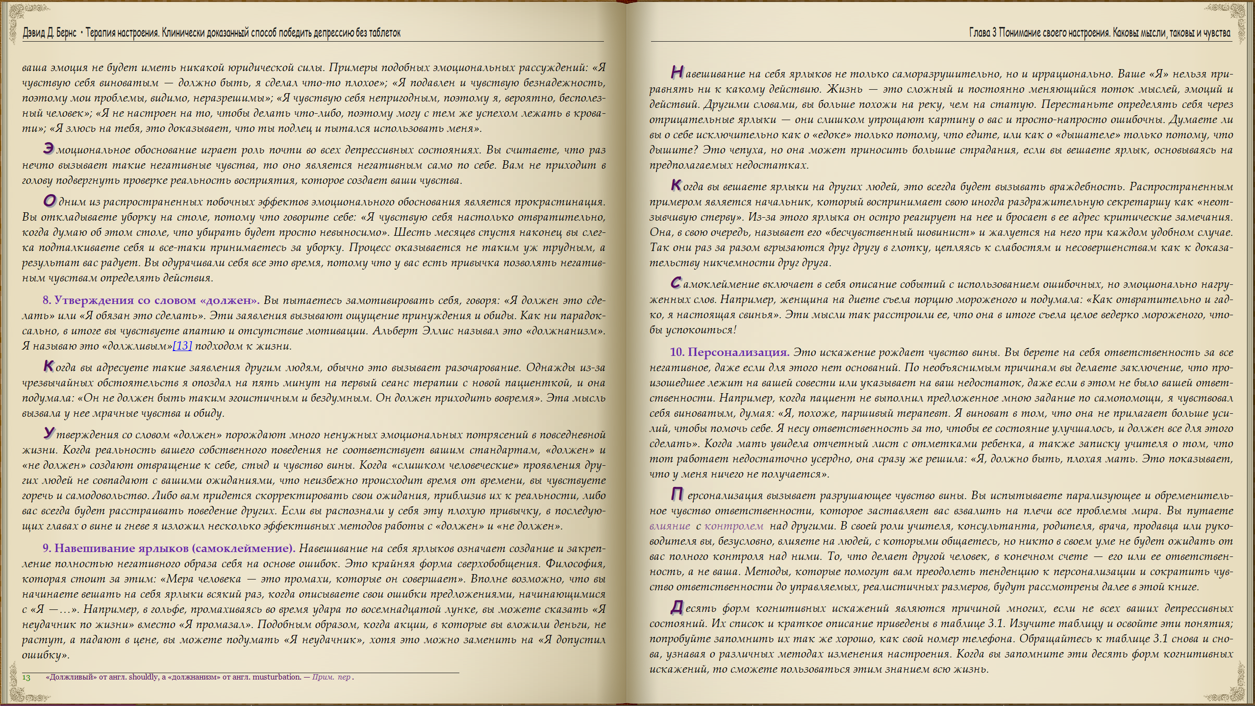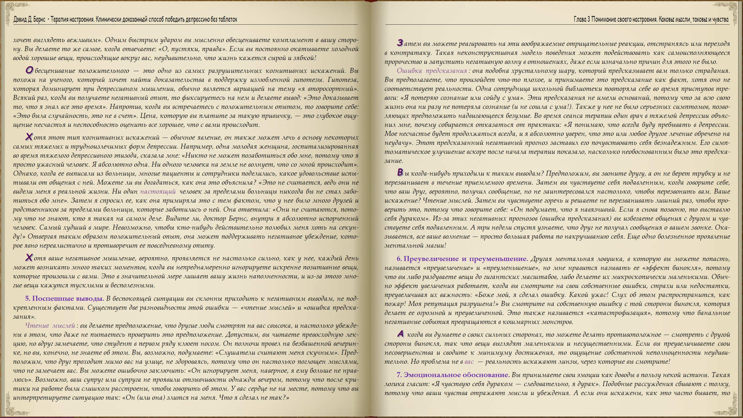 Корн О. — Не бойся будущего и не живи прошлым [МКТ] Техника тренировки внимания — (помогает избавиться от руминаций и депрессии): https://www.youtube.com/channel/UC0CyGiCBHMRq0ld3aVr4GBw Бернс Д. — Терапия настроения [КПТ] Баттиани Александр — Преодоление безразличия [Логотерапия] — (Психотерапия, основанная на поиске и анализе смыслов существования) Франкл Виктор — Человек в поисках смысла