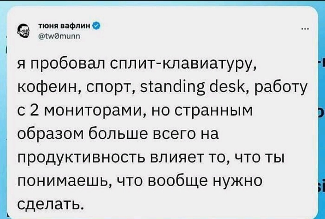 > Если вы хард прокрастинатор как я в прошлом, потеряны, апатичны и прочее, то все эти ту ду листы, мотивация, дисциплина и прочее не рабочая хуйня на начальном этапе.
