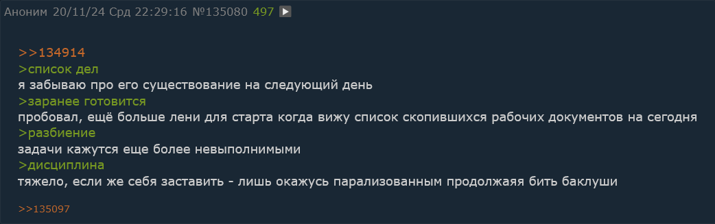 1. Составление списка дел –Нужно придумать собственный формат списка и оформления, а не пиздить у других. Получится не с первого раза, придется экспериментировать, но со временем поймешь как тебе больше нравится. –Составление "общего" списка дел, и списка на день. Мне удобнее каталогизировать их по пунктам. –Записывать важные дела, задачи и цели, а не "пописять, покакать, почистить зубы, поспать". Почему так, объясню ниже. 2. Понятное разложение того, что из себя представляют задачи –Как было написано выше: ты должен знать, что делать. По сути 1 пункт это тоже самое, ты уже составил список задач, очертил границы и то, что тебе нужно сделать, дальше ты еще больше очерчиваешь себе границы. –Ты должен заранее готовится к задачам на завтра, допустим: завтра тебе нужно понять какую-то тему по учебе, ты должен как минимум просто закинуть ссылки на сайты с объяснением темы, или накидать скринов с лекций и учебников, ты можешь их даже не читать и не проверять, важно чтобы они были. Люди прокрастинируют, потому что им даже лень начинать, а так у тебя уже есть материалы, с чего начать. Ваша задача "понять целую тему" превращается в "изучение парочки ссылок и скринов", даже если тебе нужно будет изучить намного больше - тебе уже есть с чего начать. –Дробление задач: выделяй "минимум" и "максимум". Минимум - то, что тебе нужно сделать вот точно, Максимум - чем можно пожертвовать, и что ты будешь делать, если реально сможешь и если тебе хватит времени. Проблема многих в том, что они ставят задачи только максимума, что в начале пути борьбы с прокрастинацией сделать трудно, из-за чего список дел не является "структурированием задач", чем он и должен быть, а превращается в "список причин для самобичевания. 3. Дисциплина –Как бы это не звучало, но нужно смирится с тем, что чтобы что-то делать, нужно ПРОСТО взять себя в руки. Это главное, пункты выше лишь помогут в этом, и ты можешь их пропустить, оставив только дисциплину, но если поставишь все на "помощников", пренебрегая "лидером", то нихуя у тебя не выйдет.