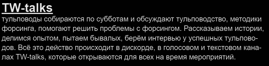 Мы стараемся быть дружным коллективом и всем новым гостям нашей уютной тульпотаверны всегда рады. Мы примем каждого ньюфага и постараемся ему помочь, а также не против послушать байки олдфагов. Белый ты или чёрный, кавказец или русский, бронь или анимуфаг — здесь ты найдёшь нормальных собеседников по тульпофорсингу и оффтопу. В таверне дурно относятся к чрезмерному и бессмысленному употреблению мата, а также к любым разговорам про призыв или астрал.