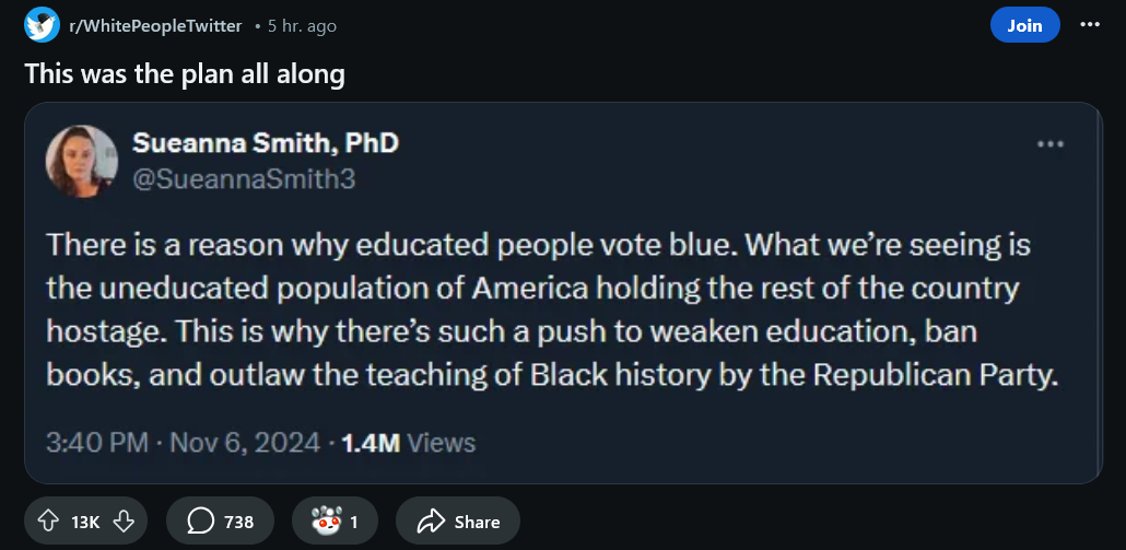 Неудивительно, что челики прошедшие такую идеологическую подготовку голосовали за Харрис, а не за Трумпа. И теперь кичатся тем, что они это илитка образованная, а Трамписты это быдлятина, челядь необразованная.