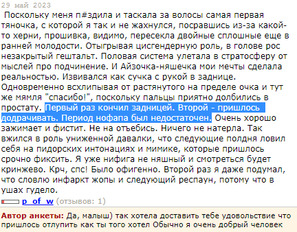 Сап, /se. Неудивительно что на этой доске довольно мало сообщений, учитывая контингент Двача, и мало удивительного почему ваш тред постоянно рейдят. Вам можно излить душу? В общем-то, я 18 лвл. Начал мастурбировать примерно с 10-11 лет, узнал сам, а что самое удивительное - начиналось не с жести. Начиналось всё с простых фотографий, где были просто девушки в нижнем белье, помню до сих пор что даже на такие фотографии шишка была колом и было нереальное возбуждение. И вот я постепенно всё больше и больше начал мастурбировать.. ну, параллельно с этим лет в 12 познакомился с одной одноклассницей, которая мне понравилась, но я почему-то осознавал что не смогу быть с ней, и как пришёл домой разрыдался. Я к тому что у меня было нереальное возбуждение на девушек и чувство любви. И вот, с каждым днём становилось всё хуже и хуже, открывал для себя полноценную порнографию, осознал что я у меня начались странные фетиши по типу трапо-порно, кроссдрессинга и так далее, хотя сам я по себе характером серьезный, принципиальный, дерзкий, импульсивный, к импульсивности ещё вернусь. Ну лет в 17 появилась тнуся, хикканша, которая реально меня любила.. и не ясно, из-за порно-зависимости это, или ещё какие-то факторы, но я стал максимально агрессивным и импульсивным. Она и так понимала, что я странный, но очень ценила мою поддержку и любовь к ней, а потому активно проявляла её тоже. В общем мы очевидно на почве моих криков и агрессии к ней расстались, а секс у нас был. 3 раза.. и вот честно скажу, максимально стыдно. Видимо из-за порно-зависимости и привыканию к руке - у меня не удался от слова совсем первый секс. Я не волновался, я был в себе уверенный, но я понимал что возбуждения нет. Вот от слова совсем, поэтому из-за того что член не до конца вставал, я не мог нормально заняться сексом, потом кое-как что-то получилось, и то потому что я начал фантазировать о чём-то. И вот я вместо того чтобы медленно заниматься сексом, наслаждаться ею, целовать в губы и грудь, прижиматься - я механически быстро туда сюда сую член, и ощущаю НИЧЕГО. Никакого возбуждения, ничего, качество секса было ужасным. Ну подумал я, первый раз всегда такой, надо ещё раз. К слову, я так полчаса провозился с ней и не кончил. Ну было ещё два раза.. такая же история, только на третий раз пришлось соврать что кончил, она не поняла и не увидела. И вот я тут.. сейчас у меня рекорды - 2/0/0/1/1/0/0/2 дней.. Сейчас как 18 часов держу его. До этого у меня был срок в 13-14 дней, и я клянусь я никогда себя так хорошо не чувствовал. Возбуждение появлялось, чувствовал кайф от жизни, появилась концентрация, которой не было. В общем и целом, можно сказать что я расшатал своей порнозависимостью свою психику. Мало того что секс для меня говно, я агрессивный и постоянно уставший, так у меня ещё и женственность присутствует из-за трапо-порно и прочих фетишей Ребят, как избавиться окончательно от этого? Я долго рефлексировал, обсуждал эту тему с нейросетью.. не по поводу избавления от зависимости, а я про в целом факт того, что норма это или нет. Пришли к выводу что это механический акт, который придумал себе человек, и что на самом деле человеку нужен секс и только секс, и человек может жить без этой потребности около несколько лет, потому что это время даётся организму на поиск партнёра, а её исправлять мастурбацией - неправильно. Вот в общем, как быть, что делать? Пи