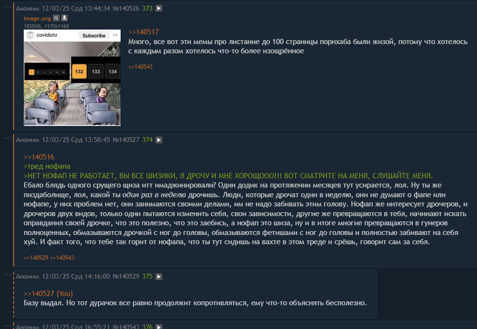 >>140543 >Эк тебя разворотило, лол. Значит я высказался не зря. Маня, ты вообще о чём, ты сидишь на вахте в треде, который тебе не нравится,от которого у тебя горит жопа, настрочил тут сообщений больше, чем кто либо, дрочишь перефорсы, и как оказалось всё это из-за того что мамуля тебе дрочить не давала. Ты же буквально терпила с давно разорванной жопой, которая из-за травмы детства не может зашиться у тебя. Вот где реальная шиза. Как просто ларчик открывался, всё твоё припизднутое поведение итт это просто гиперкомпенсация того, что тебе мамаша дрочить не давала. И теперь ты не только на свою мамашу обижен, но и на тех, кто на дрочку добровольно забил и говорит слово против. Тебе надо работать с твоей травмой детства, Мань, а не сидеть на вахте. >Вас давлю не я один. Хорошо, верю. Скринчик этого треда пришли, где видны 15-20 последних ответов, чтобы видно было, отвечал ли тут кто-то кроме тебя >хочу предупредить незнающих об опасности нофапо-секты анонов Мань, люди сами понимают когда им нужен нофап, а тут только делятся своим опытом. Тут нет нормисов, у которых никогда не было проблем, ещё раз повторю. Когда я дрочил по несколько раз в день, тратил на это множество часов, проёбывал пары, проебывал дедлайны, опаздывал на встречи из-за этой хуйни, не хотел ебать свою бывшую тян, потому что набрал фетишей и у неё было не идеальное тело из аниме, из-за чего и расстался с ней в итоге. Тогда я сам понял, что надо заканчивать с этой хуйней. И вот спустя 2 года, я рассказывают о своём положительном опыте, что реально изменилось с нофапом, что теперь свободное время есть для учёбы, таймменеджмент поправлен, мотивация появилась, влечение к реальным тян, появлявились новые отношения. Никаких фантомных религиозных плюсов здесь нет, я не получил никакие супер силы. Вот мой опыт, у других людей, может быть другой положительный опыт, но один хуй на всё это ты только всxрюкиваешь >АРЯЯЯЯ, НЕЕЕТ, ВЫ ВСЁЁЁ ВРЕЕТИИ, ВЫ СЕБЕ ВНУШИЛИ. Да, шиз, я себе внушил + 3 часа свободного времени в день. Бог, Аллах мне скинул, и теперь в сутках у меня 27 часов. И мне нахуй не надо никого "вербовать" в нофап, мне не платят денег, мне вообще похуй будет кто держать нофап, а кто задрочиться в усмерть. Я рассказываю свой опыт. Человек спросил, я отвечаю, основываясь на своём опыте. >Ну выдели себе время раз в пару дней на листание. И не отказывай себе в фетишах. Мань, спасибо что ответил мне, но хочу расстроить, этот совет полная хуета. У меня стаж дрочки был 11 лет. Сам разобрался, что мне делать и как стало лучше. 2 года назад мне вот только твоего совета не хватало, что я оказывается, нихуя себе, мог просто взять и начать дрочить раз в неделю по 30 минут. И вот такими советами ты предупреждаешь анонов, лол, ради этой хуйни ты сидишь здесь? >ДЕЛАЙТЕ ХОРОШО, НЕ ДЕЛАЙТЕ ПЛОХО. ВОТ ДРОЧИТЬ НАДО 1 РАЗ В НЕДЕЛЮ За сотни историй тех, кто хочет вкатиться в нофап, я не видел ни одной, чтобы она начиналась так: >Ну вот я дрочу раз в неделю, у меня всё заебись, работа есть, брат живой, тян ебу, но вот что-то захотелость вкатиться в нофап. Не было таких историй, у всех проблемы были с дрочкой, и в том то и дело, Мань, что у порнозависимых нет силы воли, чтобы сразу нормализовать свою дрочку. Алколики не могут, упарываясь синькой каждый день, просто в один момент начать пить по бокалу вина в неделю. Они прекращают пить полностью. Потом, если уже бу