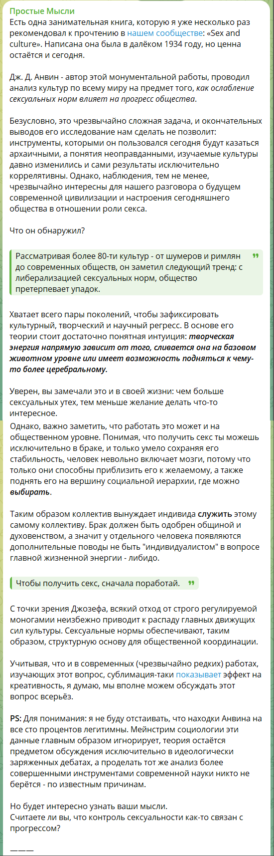 >>141406 Спасибо за пожелания! >>141417 Фетиши там всякие, видео с обычной классикой никогда не нравились и не привлекало (только в детстве по рентв). >>141421 >это же какой прилив бодрости, мотивации, самоуважения, и, не знаю, "пролайферства" у тебя должен был быть Да, я тогда не сильно напрягаясь просто взял и побил все свои силовые спортивные рекорды, только сейчас во второй раз к ним подбираюсь спустя лет 10. Тогда же и в медитациях были глюки мощнейшие, в осознанные сны только так вылетал, на одном намерении. >Разве у тебя не появилось какой-то характерной "антидодиковой" невербалики, интуитивно-инстинктивного понимания, как вести и преподносить себя в социуме, а также глубокого, чистого, пронзительного взгляда, который бы зацепил какую-нибудь тян? Или ты не выходил в люди? Я не выходил в люди, у меня никогда не было друзей и знакомых, я после учёбы/работы всегда шёл домой, никуда не ходил и ни с кем не общался. >обычный чел, не монах, способный на такой самоконтроль, не смог заинтересовать ни одну тян Я бы точно не смог, для меня это что-то из параллельной реальности, непостижимые вещи для моего разума, мне интереснее нофапать для каких-то духовных практик, метафизических откровений, для спортивных результатов в конце концов.