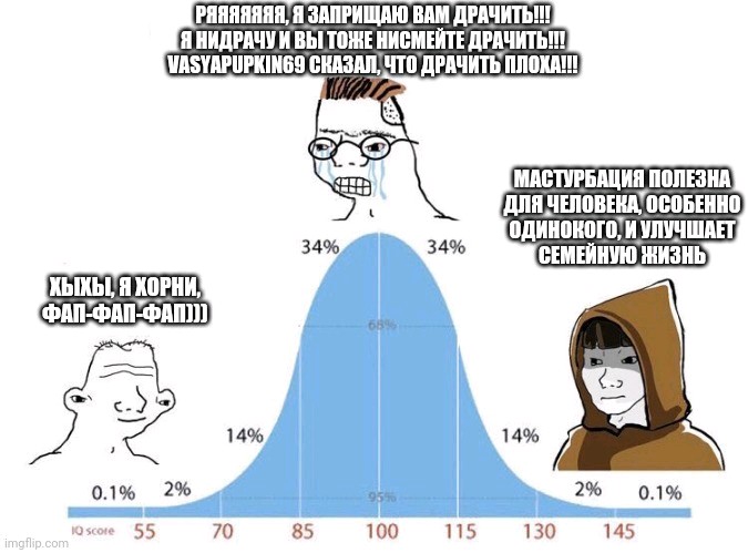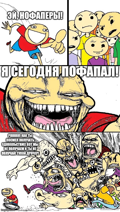 Зачем я тут высказываюсь, спросишь ты? Потому что хочу предупредить незнающих об опасности нофапо-секты анонов. Пробовал ли я сам нофап? О да. Я из религиознутой семьи и до 17 лет НЕ ДРОЧИЛ ВООБЩЕ. Потому знаю последствия. Вывода два: религии как и нофапо-шиза - это кал, навязывабщий вину за естественные потребности. И да, это вредно для психического и физического здоровья. Так что соси хуй и не писхуй.