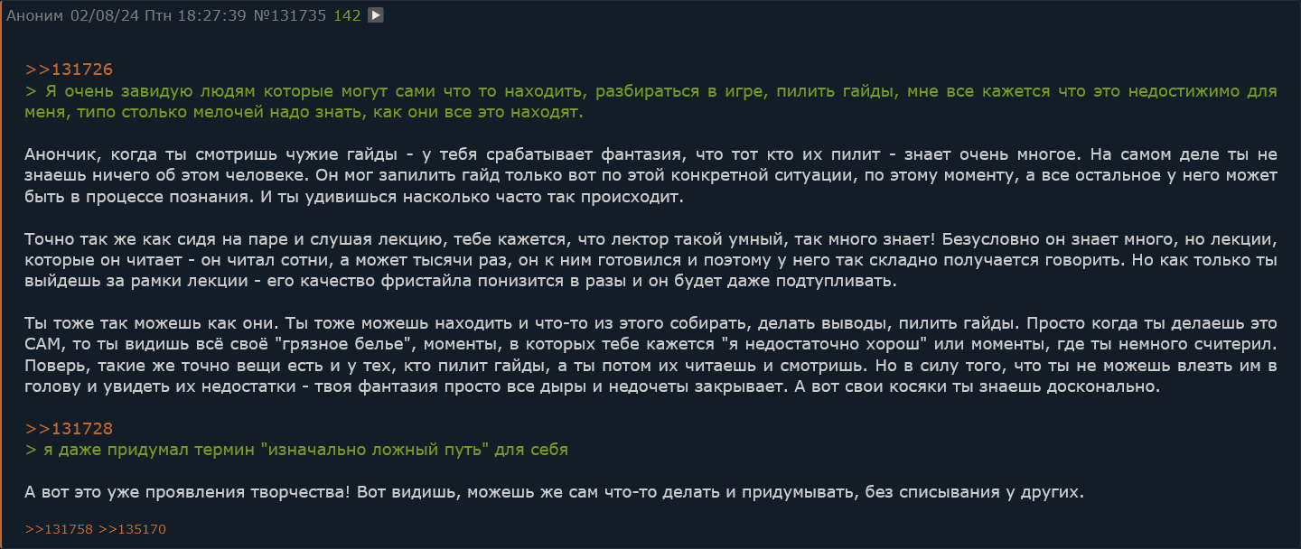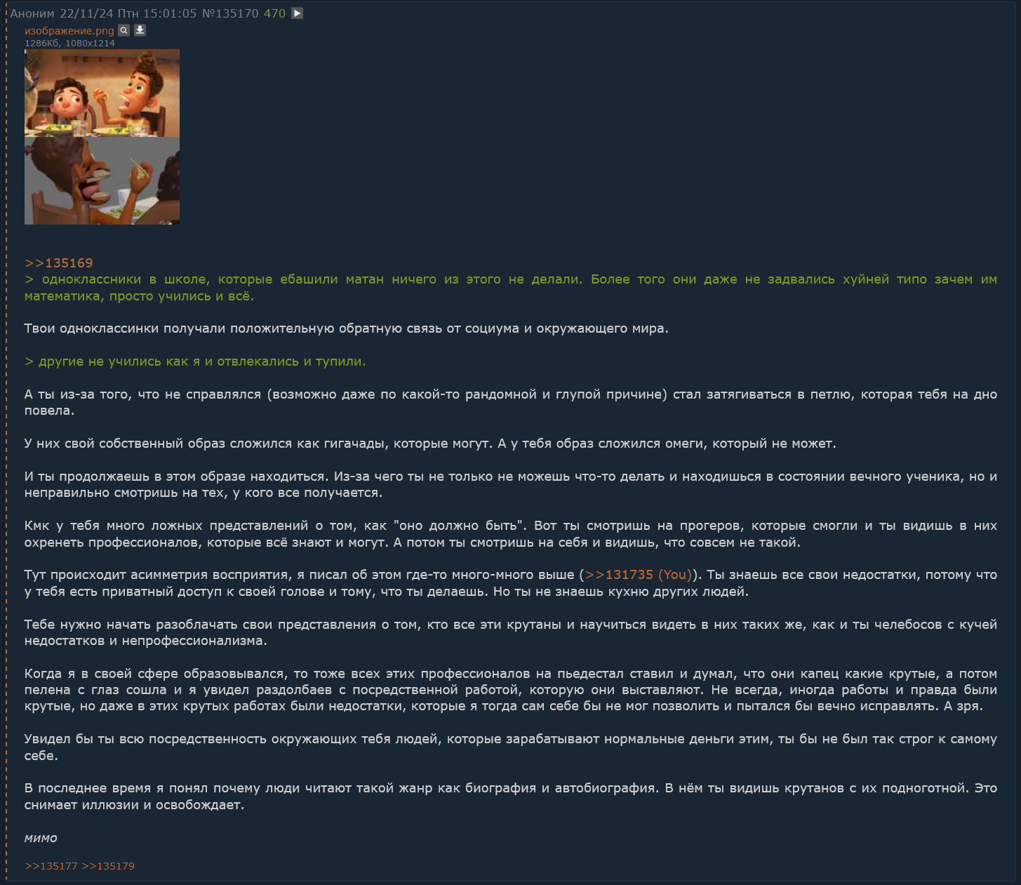 >>137793 >Со стороны трубят, что надо ходить в кончалку, дрочить цифровой макакинг, луксмаксить, кушать бады, медитировать, читать книжку, чтобы быть умным, перекатываться за бугор, а ему тотально похуй Открою секрет: любому должно быть похуй, в том числе и успешнохую. Ты описал адекватного человека, пытался привести его как противовес человеку с амбициями, но почему-то показал просто нормального хомосапиенса, в отличии от тревожника, который как раз и думает только о том, как бы ему максимизировать количество принимаемых БАДов и развить скорость чтения до 3 книг в день. Человек с амбициями это не двачер, который мечтает о том, как он будет ебать проституток на яхте, пока школьные обидчики, привязанные к мачте, будут трястись от его бицухи и взгляда грозного и властного человека, и как ЕОТ будет каждый день жалеть о том, что отказала в танце на выпускном такому гигачаду. Человек с амбициями делает, получает желаемое, и двигается дальше, получая все больше и больше. У него нет времени на тряску, потому что тревога – следствие руминации, присущей как раз фантазерам и манямечтателям.