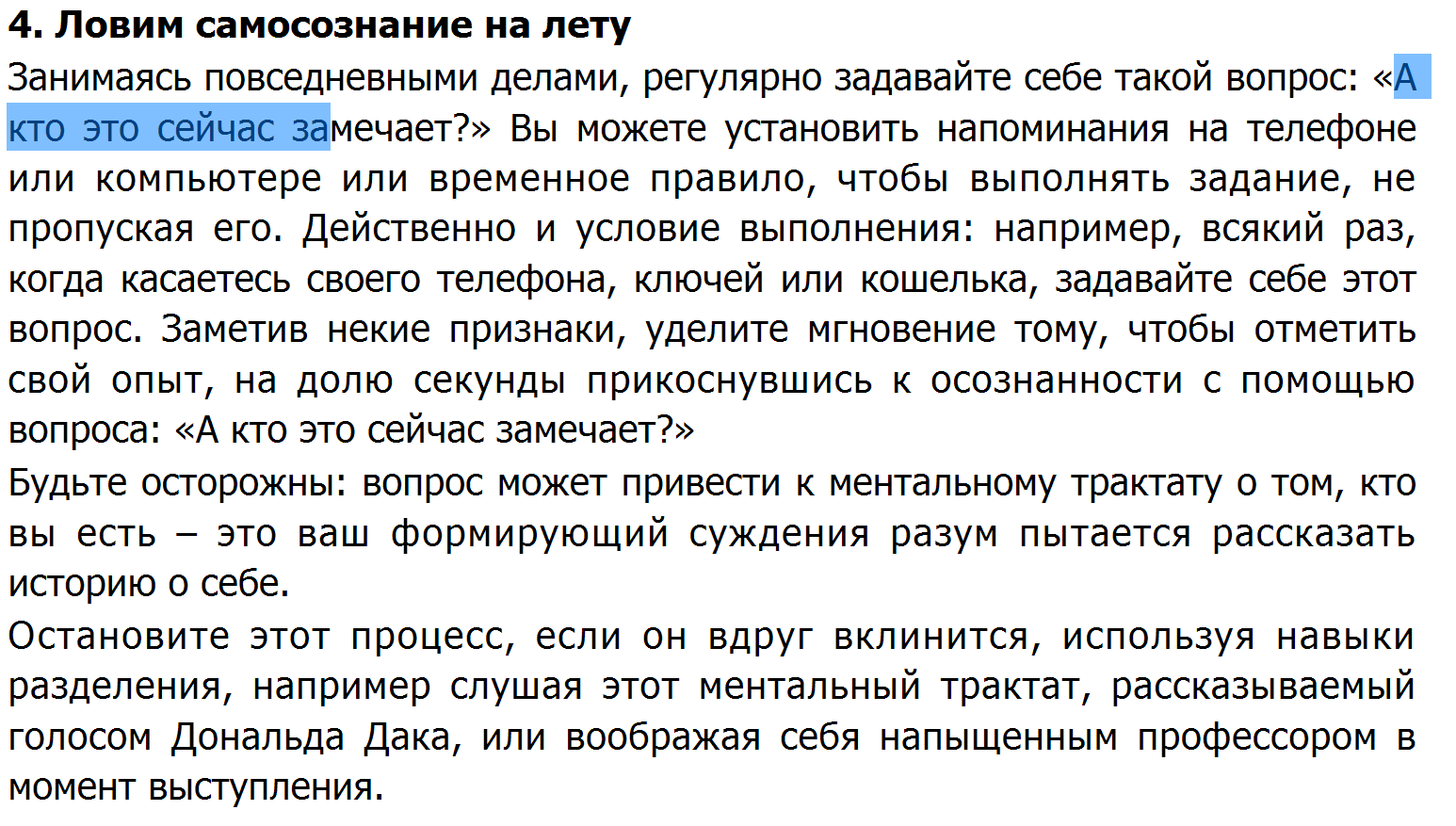 Человек, отслеживающий метанаблюдателя по приведенной тобой инструкции, способен постепенно выйти из под гипноза каждой отдельной субличности, представляющей собой отождествление с тем или иным комплексом мыслей (я левак, я правак, я двачер=неманя, яне делаю бесполезной хуйни и т.д. и т.п.). И постепенно начать царствовать над ними, то есть включать и выключать по необходимости, как эдакие приложения. Давать распоряжения и пользоваться, а не быть их марионеткой. Роли-программы прилипчивы, как чертополох, вирус и пиявка вместе взятые. Крайне наглядное зрелище ты можешь видеть в политических и религиозных срачах в интернете. Когда набор инструкций не позволяет человеку мыслить непредвзято, да и мыслить вообще, так как мыслить предвзято значит ретранслировать набор заданных установок, быть всего лишь их промежуточным носителем.