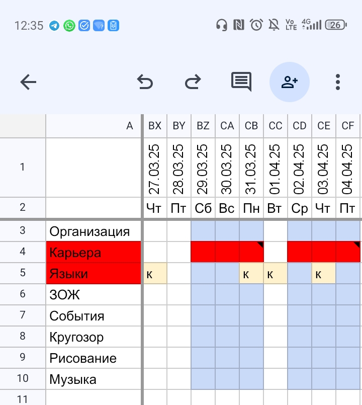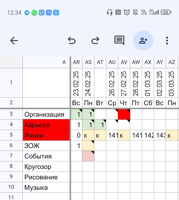Веду гуглтаблицу, синхронизировал на всех устройствах. Если презентация, или экзамен, то в этот день ячейка красная и несколько дней до этого тоже. Значит в других сферах освобождаю по максимуму себя от всего. На ближайшие полгода в принципе заполнил рабочие дедлайны. Теперь буду заполнять другие направления в порядке важности. Если в целом выполнил, то ставлю 1 и крашу в зеленый (очень люблю цвета) и отчитываюсь что конкретно превозмог. Если не выполнил, то ставлю 0 и пишу причину. В строке События пишу обычно свое настроение, самочувствие.стараюсь чтоб в день было максимум 2 самых важных дела, не больше.