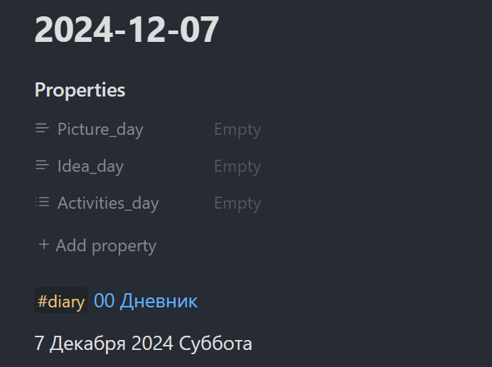 Я несколько месяцев назад начал в качестве эксперимента собирать в обсидиане картинку дня, идею дня (обычно это какая-то новая заметка в обсидиане) и основные активности (вроде занимался ли спортом сегодня, какой фильм посмотрел, какую книгу читал и т.п.)
