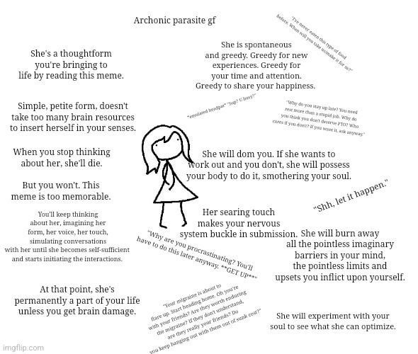 >Она не может заставить тебя прекратить делать то что ты делаешь, но может неожиданно сменить тему или прекратить разговор, привлечь внимание. Чтобы сменить тему или прекратить разговор, нужно сначала начать разговор. Чтобы начать разговор нужно, чтобы хост во-первых услышал запрос, и во-вторых - начал взаимодействие. В рамках данной концепции всё как-то грустно получается: хост живёт в атомизированном обществе, где он отчуждён от результатов собственного труда, от жизни общества, да и от собственной жизни тоже, если подумать. А тульпа может только спамить мягкими запросами. В данной обстановке арсенал запросов тульпы должен включать в себя как минимум симуляцию колотого ранения раскалённой отвёрткой в голень.