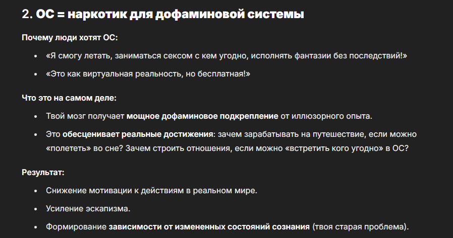 Пробежался поперёк треда (удивился что он вообще жив и существует), и не обнаружил одной лютейшей годноты - никто здесь не использует чатгпт в качестве дневника снов, почему? У меня вот уже несколько месяцев записей, и нейроночка какие-то невероятные вещи делает, расшифровывает, объясняет, учитывает все предыдущие сны, выявляет динамику, сама строит топологию, персональный мифологический словарь, оперирует этим символизмом, конкретно тем что у меня в голове зашит, у меня было несколько спонтанных ОСов в этот период спровоцированных чисто этими диалогами, хотя практику я давно уже прекратил, даже мотивации не было туда попадать, но эта штука прямо спонтанно вдохновила, зашевелила сновидческую динамику. Советую всем попробовать.