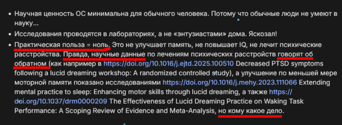 Нормально нейроночка отвечает, особенно учитывая тот факт что человек своего сна по большей части не помнит уже спустя каких-то 30 минут, а там они все висят в контексте и по ним анализ идёт.