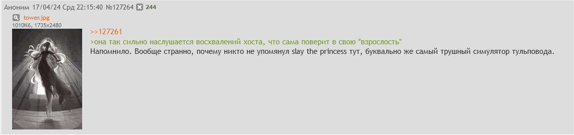 Почему одним везёт, а другие просто ОБЯЗАНЫ надрывать жепу для результата? или однажды удача отвернётся и... всё? В своих простынях ты выразил мнение, что надо просто жить этим и всё получится. Даже не так. Ты буквально обозначил, что это всегда работает, приводя в пример Донка, и себя лол. Первый просто 14 лет в кс играет. Твоё величество же достигло довольно неплохих результатов для подобной отдачи, хотя ты всё очень размыто описал, без сути. И что за игра вообще? китайская гача? пубг? тогда не впечатлил. Вывод — обычный такой несмышлёныш соевый, в кладези аргументации которого "ну кури мат часть, а потом что-то делай, жизнь посвящай, но не посвящай". Если ты ещё и на реддите зависаешь, то прости, тогда совсем как-то неловко. >Для начала азбуку. Ладно, я несколько ошибся, когда назвал тебя интересным человеком. Надеюсь отсвечивать больше не станешь. Обиженка.Нюня.Люся.