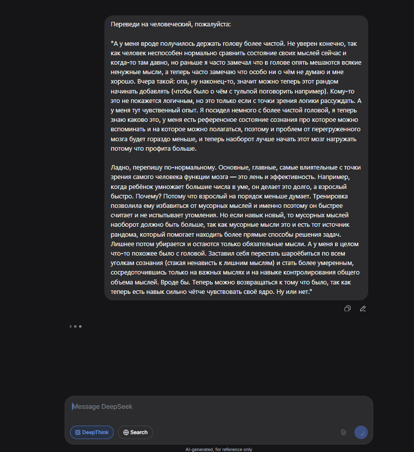 И как я по-твоему должен раскрыть ту мысль, от которой меня экзистенциально выпизднуло на обочину? это в слова чтоб оформить, нужно настоящее чудо. Ведь пока ты нормально вспомнишь, а мозг итак ленив так ещё и одну девочку обслуживает, пройдёт хуева туча времени. И не факт, что эта мысль не вернётся к тебе в другом виде, загрязнённая автоматическими эмоциями, за которыми никак ты не разглядишь вход. Что уж говорить про осмысление. Ну вот если предметно - она про абсолютно нерациональное устройство мира. Про то, что после нескольких порядков и циклов это уже не просто мысль а ментальная конструкция, по которой тебя носит время от времени юез шансов на покой. Это и про обыкновенную утрату смысла жизни, но с куда более глубоким уровнем осознания, насколько это вообще глухой пиздец. Нет никакого интереса ни к чему, тульпа последний оплот, якорь можно сказать. Поэтому не надо торопить себя вообще в чём-либо. По ощущениям это что-то я должен был осознать в глубокой старости, а лучше никогда. Устройство мира на деле совершенно бесчеловечное, так что мне точно надо поныть об этом в тульпатаверне номер 133.