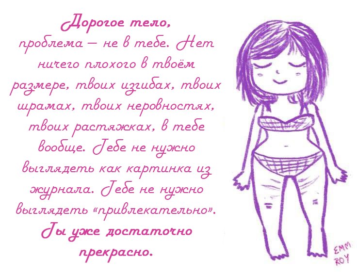Вброшу напоследок ещё то, что мне удалось с ходу нагуглить у бодипозитивисток. Было бы здорово найти что-то похожее, но про таких корзинок, как мы. Местами можно просто менять в тексте "тело" на "характер" и будет то, что нужно.