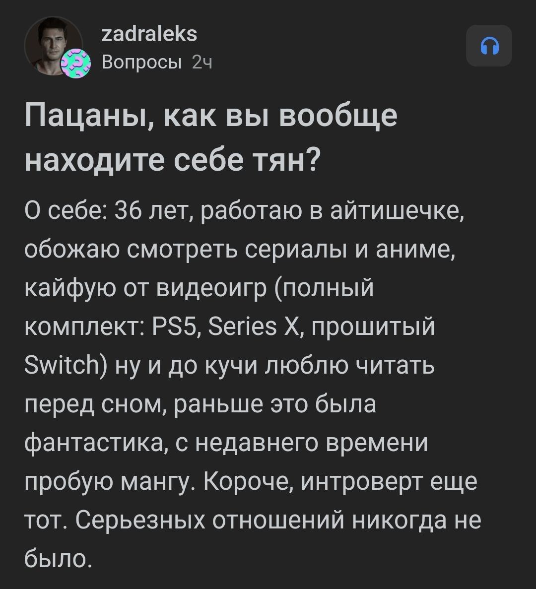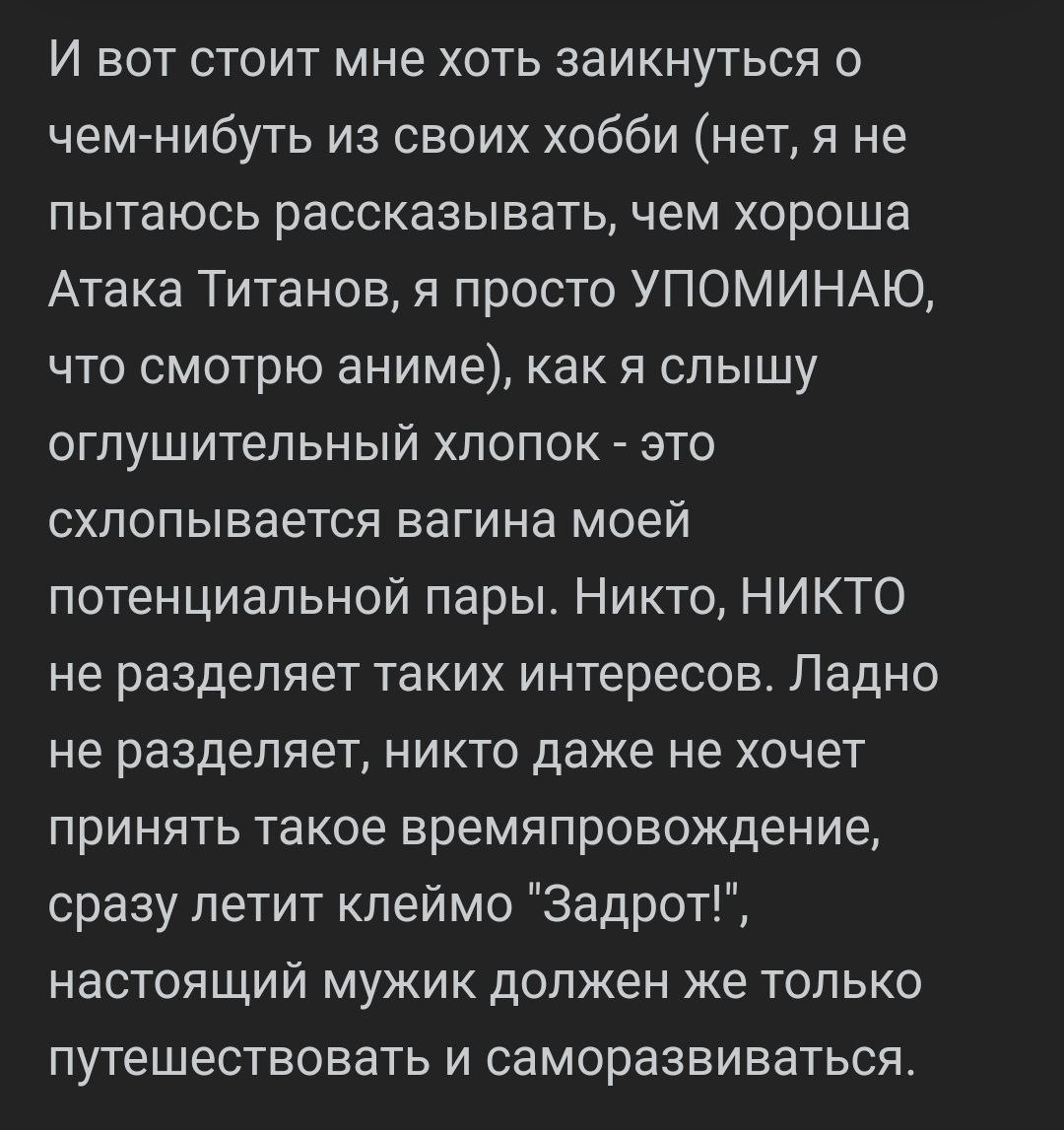 Всем похуй, но поделюсь и своей историей. С самого детства мне доставляло аутировать одному. Друг по неделе мог вытаскивать на улицу просто погулять, а когда приходил в гости, я предлагал поиграть в "давай поскучаем". Суть игры была в том, что каждый молча залипает в окно и думает о чем-то своем. В лагере я был известен как тот-парень-который-постоянно-читает. При этом особых проблем с в общении со сверстниками не было, были друзья, приятели. Занимался горными лыжами, ушу, количество дипломов с разных соревнований было таким, что они покрывали половину стены в комнате. Потом был военно-спортивный клуб, прыжки с парашютом, немного БИ, сплавы, походы и т.д.. Работал с 13 лет, в 15 лет ездил по другим городам на объекты, закончил школу единственным парнем с медалью в своем году и самым высоким суммарным балом по егэ в школе, при этом по-черному бухая с самым отмороженным быдлом, которым я сам, собственно, и являлся, бросать я начал тогда, когда большинство сверстников только начинали пробовать. Когда уехал на учебу в вуз решил "погулять", спал без обязательств с тянами в выборке от 17 до 32 лвл, не тратя не копейки т.к. сам нищеброд. Подруги просто приезжали ко мне, мы спали вместе, на этом прощались до следующего раза, ни одну из них я не знал как человека. Последние два раза сам все прекратил, просто потому что надоедало, проще было самому подрочить. Все это я к тому, что попробовав самые разные социоблядские вещи, я так и не нашел в них что-то особенное. Мне все так же доставляет целыми днями сидеть перед монитором, ни с кем не контактируя, будучи с детства расположенным к сычеванию, для меня тащемта со временем и разным опытом ничего не поменялось.