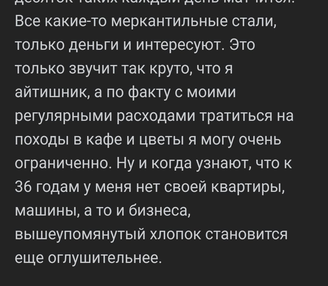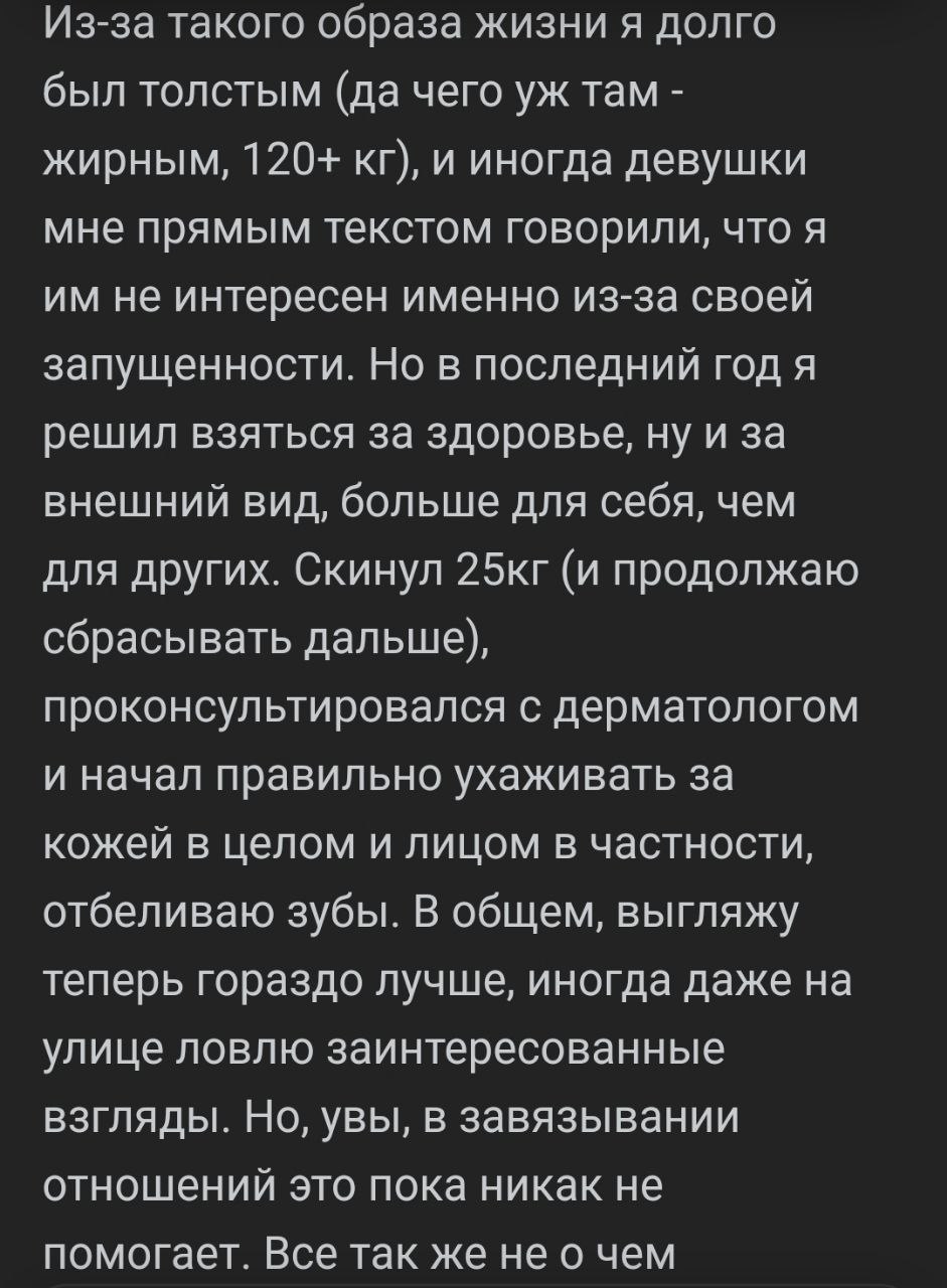 Имею работку за 45к, к осени сваливаю на отдельную квартиру, посещаю качалочку 3 раза в неделю, получил права. Друзей нет, тян нет и никогда не было, от попыток флирта наваливаю полные штаны кирпичей.
