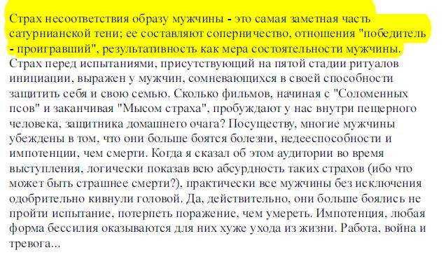 Господа, ОП снова на связи. Приятно видеть, что какая-никакая активность в треде есть. За время отсутствия накопилось немного материала, который я потихоньку буду вбрасывать. Начну с книги, которую уже советовал один анон из треда. Джеймс Холлис - Под тенью Сатурна Мне нравится юнгианская психология, я считаю, что символы и архетипы имеют колоссальное значение в нашей жизни. Холлис исследует тему психологии мужчин именно с этой точки зрения. Книга довольно хорошая, много дельных вещей, но читать её очень и очень тяжело. Дело не в том. что она скучная или плохо написана, как раз наоборот. Это, что называется, "по больному месту да калёным швом". Есть какое-то глубокое внутреннее сопротивление во время чтения этой книги, как будто действительно находишься под тенью Сатурна. Но после прочтения наступает облегчение от понимания того, что ты не один такой и ты не виноват в том, что тебе не хватает мужественности. Но расхлёбывать эту кашу всё равно тебе. Неистово рекомендую.