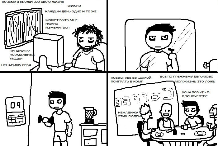 Давать советы анонимам с двача — задача сложная, потому что этот контингент обычно скептичен, умен, начитан и обладает очень мощным "детектором лжи" на банальности в духе «просто улыбнись миру». Ситуации, часто встречаемые итт, — это классическая картина клинической депрессии (или субдепрессии), смешанной с экзистенциальным кризисом среднего возраста. Вот советы, разделенные на уровни: от «починить тело» до «починить смыслы», которые могли бы реально помочь, если отбросить цинизм. 1. Уровень «Железо» (Физиология) Многие аноны пытаются решить проблему мыслями, когда проблема в химии. Ощущение «серого мира» и «отсутствия чувств» (ангедония) — это почти всегда сбой нейромедиаторов. Чекнуть «щитовидку» и тестостерон. После 30 лет гормональный фон меняется. Низкий тестостерон или гипотиреоз дают именно такие симптомы: вялость, апатия, «жизнь — тлен». Это не философия, это биология. Признать депрессию болезнью. Если у машины сломался двигатель, он не поедет, сколько его ни уговаривай. Если мозг перестал вырабатывать серотонин/дофамин, никакие поездки на Бали не обрадуют. Тут нужны не «новые впечатления» (они просто не усваиваются), а, возможно, курс антидепрессантов (подбор с врачом), чтобы просто вернуть способность чувствовать вкус еды и радость от прогулки. 2. Уровень «Софт» (Психика и Дофамин) ОП (автор поста) пишет, что пробовал детокс, но стало скучно. Проблема в том, что рецепторы «выжжены» годами быстрого контента и/или алкоголя. Перестать искать «ВАУ-эффект». Аноны грустят, потому что ждут от прогулки по лесу экстаза, как от наркотика. Совет: снизить планку ожиданий до нуля. Гулять не чтобы «преисполниться», а просто чтобы дышать. Удовольствие возвращается очень медленно, через скуку. Слезть с «кредитного» счастья (алкоголь). Анон, который описывает алкоголизм, очень точно подметил: алкоголь берет радость в долг у завтрашнего дня под огромные проценты. Совет жесткий: признать, что трезвая жизнь будет скучной первые полгода-год. Это период восстановления химии мозга (постабстинентный синдром). Его нужно просто перетерпеть, как гипс на сломанной ноге. 3. Уровень «Смыслы» (Экзистенциальный) Это самая сложная часть. Кризис 30 лет — это понимание, что «сценарий» (школа -> универ -> работа) кончился, а новый никто не выдал. Отъебаться от себя (и от «нормисов»). Много боли в треде идет от сравнения. «Нормисы рады ипотеке, а я нет — я сломан». Совет: Принять, что «успешный успех» — это маркетинговая чушь. Не хотеть карьеру, детей или машину — это нормально. Грусть возникает не от того, что у тебя этого нет, а от того, что ты грызешь себя за то, что должен этого хотеть. Разреши себе быть «странным» одиночкой, которому достаточно малого. Сменить парадигму с «Потреблять» на «Создавать». Аноны жалуются на потребление: игры не радуют, фильмы не радуют, поездки не радуют. Это тупик. Человек эволюционно заточен на созидание. Совет: Начать делать что-то руками или головой, где есть видимый результат. Чинить старую технику, писать код, строить дачу, рисовать, готовить сложную еду. Кайф после 30 часто приходит не от развлечения, а от компетентности и результата труда, который можно потрогать. 4. Уровень «Социум» Искать «своих» шизов. Жалоба на поверхностные разговоры понятна. Но ошибка в том, что аноны пытаются говорить о глубоком со случайными людьми. * Совет: Глу