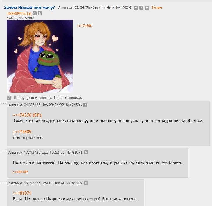 На сосач я захожу как в дурку-зоопарк, посмеяться с местных шизоидных инвалидов. Делаю это с 2010го года, так что отказаться от данной привычки не могу.