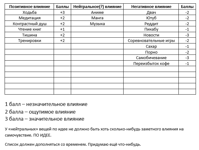 Алсо, уже вторую неделю практикую полный отказ от любых отвлечений. У меня есть следующие категории: 1) Учёба по универу 2) Предмет 1 (навуки всякие и другие области знаний для развития кругозора и т.д.) 3) Предмет 2 (больше что-то практическое, какие-то навыки и проекты) 4) Развитие личности (соц. навыки, уверенность, прокачка внешних атрибутов и внутренних, такая тема) 5) Чтение 6) Просмотр кино