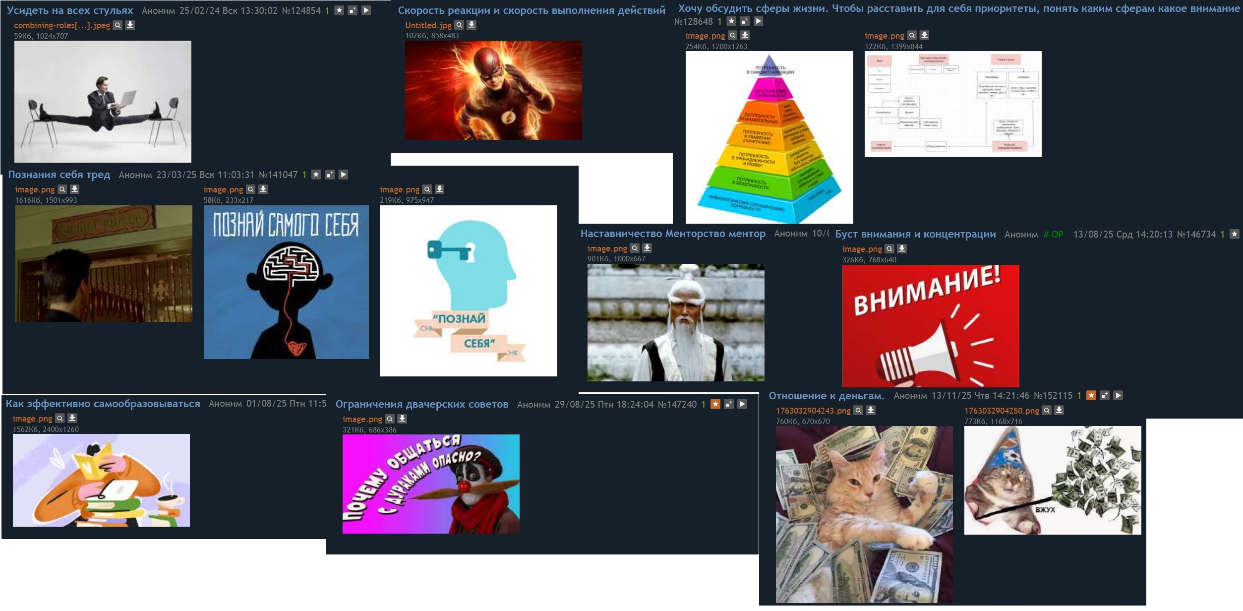 >>154567 > ответственность за свои решения Очень недооцененная вещь кста. Даже "выученную беспомощность" придумали, типо что-бы понятней было, но понятней не стало. Человек вместо решения проблемы, крутит ее в виде идеи/страха в голове, а действует на 50% неосознанно.