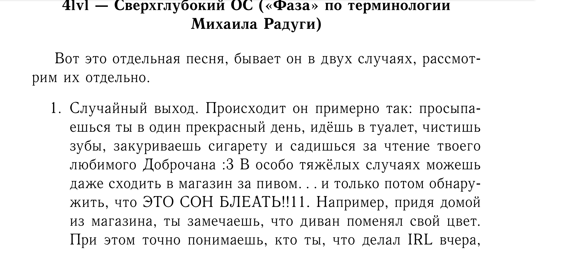 И ещё есть вопросик: у меня никогда не получался прямой метод просто потому, что везде про него написано как-то размыто и неточно. Вот у меня случился "провал сознания" на засыпании — и что дальше? Кто-то пишет, что нужно вернуться и уже просто заснуть, кто-то — что нужно как бы до конца постараться вникнуть в этот провал, а потом очнуться, и ты как бы прямо со старта сна будешь осознанный. Кто-то вообще пишет про фантомные раскачивания и что, типа, можно настолько раскачаться на засыпании, что в итоге выкатишься. В общем, не знаю. Как вы делаете прямые техники?