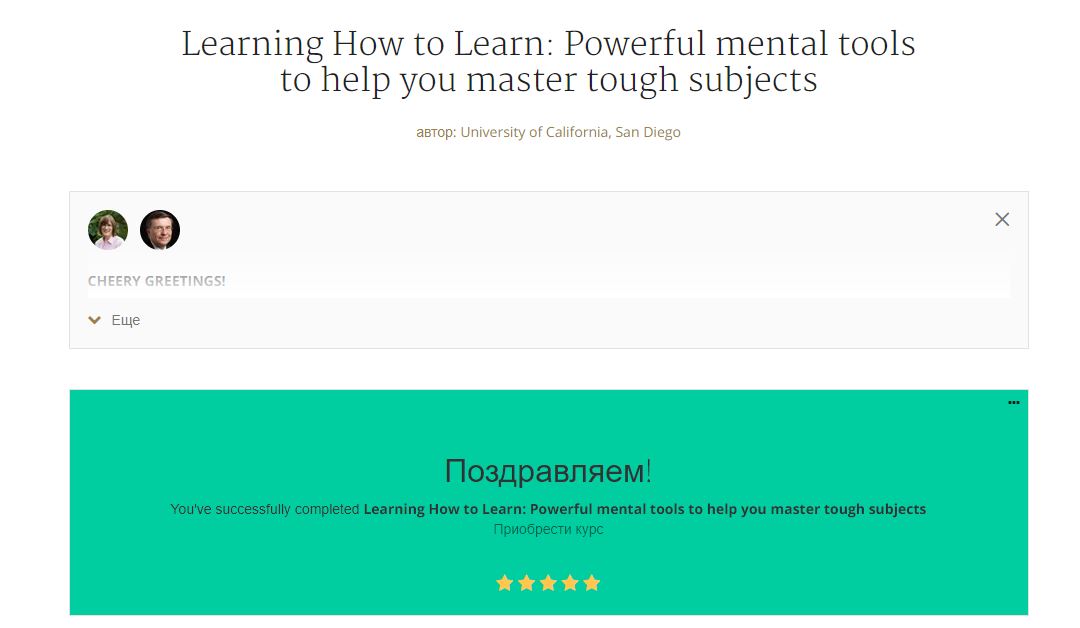 >>59464 >Для начала порекомендую https://www.coursera.org/learn/learning-how-to-learn потому что это единственный курс на Курсере, который я осилил до конца как обязательный для понимания механизмов обучения и работы сознания. Во многих курсах есть комментарии типа "очень помог мне в жизни" или "лучшие практические рекомендации", но только тут я могу на 100% под этим подписаться. Говорят на английском, есть русские субтитры. Есть книга Оакли "Думай как математик". Там все тоже самое что и в курсе, только на русском. Книга годная.