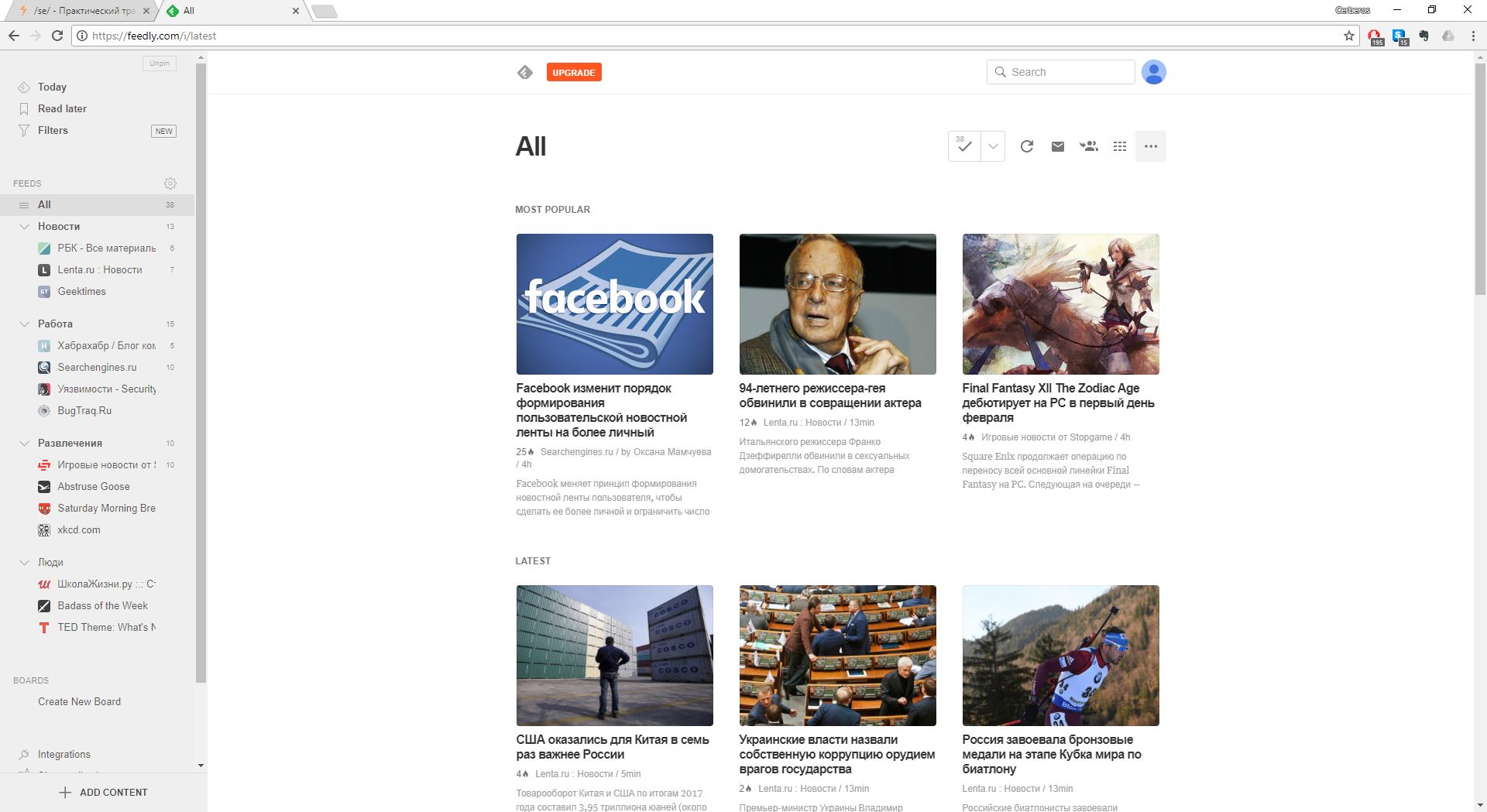 Интерфейс прост, как мычание - слева рабочая панель с фильтрами и папками, в центре и справа - информационное поле с собственно новостями. Вкладка Feeds нужна для сбора рссок по тематикам, Boards - относительно новая фича, которая позволяет сохранять и делиться лучшими из новостей по тематике. Множество крутых функций, вроде мультиплеера и интеграции с Wordpress в 2017 стали платными, но для начала хватит и этого. Любители странного могут попробовать Flipboard: он немного сложнее, но интерфейс интереснее и проще чувствовать, что БУДУЩЕЕ УЖЕ ЗДЕСЬ. Все остальные хорошие аналоги - по ссылке https://lifehacker.ru/2017/07/24/6-rss-services/