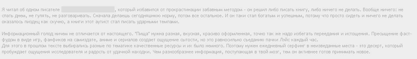 Один из лучших тредов за всё время. Не хватает, конечно, некоторых моментов. RSS-фид, на мой взгляд, неудобен, к тому же неясно, как ограничить поток, если тебе нужно читать некоторые источники, но ты бы хотел не видеть по 20 постов в день от них, а только саммари. Плюс, я давно хочу увидеть нормальный комплексный софт для планирования времени, чтобы в нём одновременно можно было вести расписание, вести лог даже из тех дел, которых не было в расписании, и юзать помидорки. А если бы туда еще можно было бы вносить заметки а-ля дневник, то вообще цены бы не было. Но в остальном ОП охуенен.