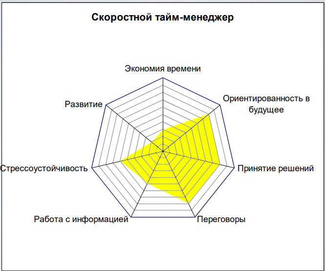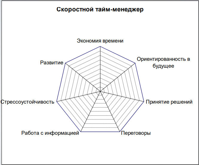 1). Экономия времени. В случае если вы, подходя к задаче, уже наперед думаете о том, где и как вы могли немножечко сэкономить времени, где я мог сделать эффективнее, Ищете новые пути экономии времени, то на этом пункте вы можете ставить себе высокий балл. Если вы, предположим, двигаясь в общественном транспорте, сидите и ничего не делаете, то это уже не 10 и не 9. А если вы в это время читаете или ищете новую полезную информацию, то это будет дополнительный балл к вашей экономии времени. 2). Ориентированность в будущее. Данный параметр говорит сам за себя, если вы, хотя бы, озвучиваете себе задачи, хотя бы представляете или мечтаете о чем то, это уже не 0, и не 2, и не 3, можно ставить чуть выше. Если вы еще и прописываете свои задачи, значит вы должны поставить выше 5-6. Если вы еще отслеживаете свое продвижение, то вы большой молодец, ставьте высокий балл. 3). Принятие решений. Принятие решений складывается из двух параметров. Первое - это скорость принятия решений, т.е. не затягиваете ли вы их, получили какую то информацию - пошли применять. Второе - взвешенность или качество принятого решения. Если после такого быстрого решения вы жалеете о том, что не выбрали другое, то это не высокий балл. А если вы принимаете решение быстро, а в дальнейшем понимаете, что решение было верным, естественно это высокий балл. 4). Переговоры. Все в нашей жизни это коммуникации. Есть даже исследования ученых, что мы думаем, благодаря языку. Язык - это свойство переговоров, коммуникации, а они должны быть эффективными. Коммуникации могут быть и с самим собой, когда мы ставим задачи себе, с другими людьми и от этого зависит, как мы можем эффективно использовать время. 5). Работа с информацией. Если вы работаете с информацией быстро, у вас есть отличные способности к анализу, как текста, так и цифровых данных, следовательно вы эффективнее других людей. Следует ставить высокий балл. 6). Стрессоустойчивость. Ну я думаю тут все просто, вам не следует объяснять. 7). Развитие. Если вы постоянно чем то занимаетесь - плаванием, языком, курсами, игрой на музыкальных инструментах, естественно это высокий балл. Если вы в свободное время серфите в интернете, капчуете, втыкаете в аниму, играете в игры, пожалуй это не очень высоко.