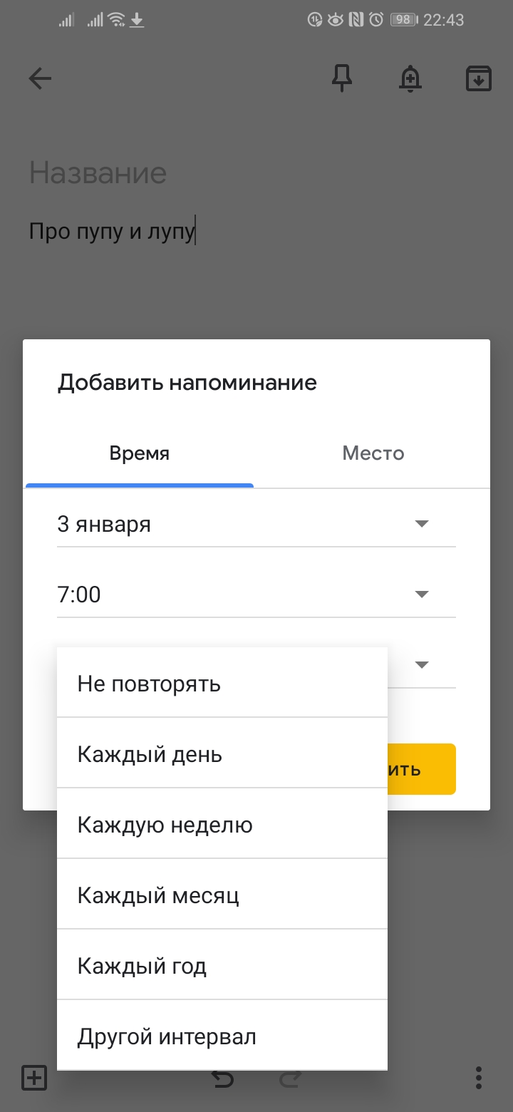 >>92660 > Разве что огорчило отсутствие возможности ставить таски которые повторяются через день/неделю/месяц, но это Есть в google keep. А ещё там есть интеграция с гугловским календарем и много чего ещё. Рекомендую