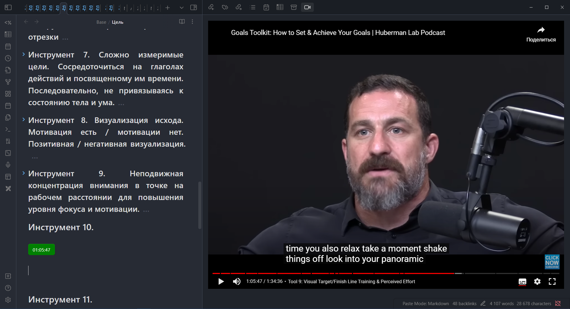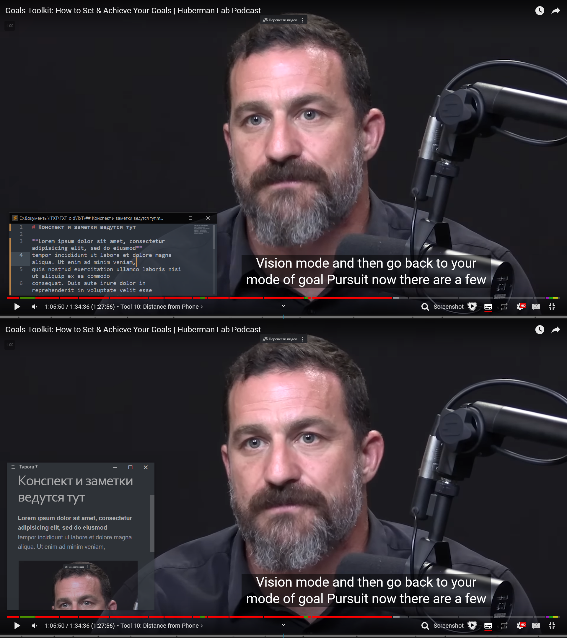 Пробовал в два окна - рядом друг с другом открывать, где в одной стороне текстовый редактор или сразу прога с заметками вроде Joplin / Obsidian, а в другой стороне окно с видео. Тоже было не очень удобно. Хотя итоговый мой способ будет очень похож на этот)