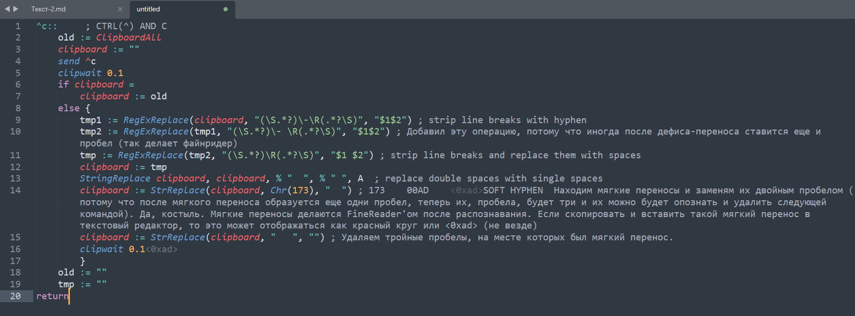 Раз уж я AutoHotkey упомянул, то еще поделюсь скриптом для копирования текста с pdf. Если без скрипта копируешь, то переносы на каждой строке появляются. Скрипт эти переносы удаляет. Однако, он и переносы абзацев тоже удаляет. Плохо конечно, но уж лучше, чем ничего.