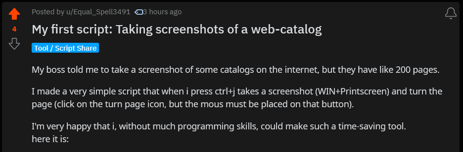 Вообще программа кайфовая. Можно много чего в ней намутить, включая монотонные репетативные действия автоматизировать. Вон, например, чел с реддита автоматизировал задачу создание скринов с сайта, которую ему дали на работе.