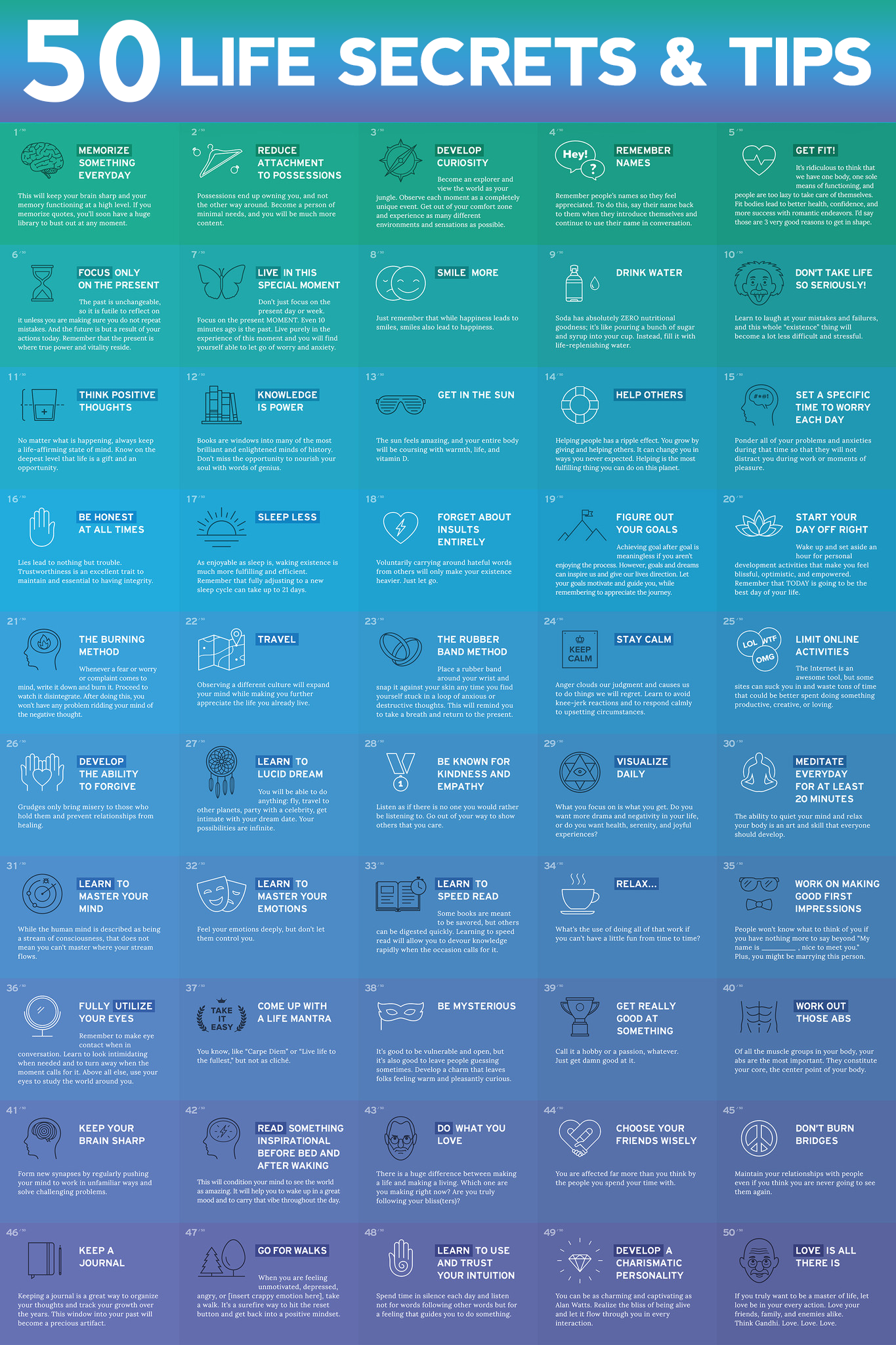 1) Запоминайте что-нибудь каждый день 2) Уменьшите привязанность к собственности 3) Развивайте любопытство 4) Запоминайте имена 5) Будьте в форме 6) Сосредоточьтесь только на настоящем 7) Живите в особый момент 8) Больше улыбайтесь 9) Пейте воду 10) Не вспринимайте жизнь всерьёз 11) Мыслите позитивно 12) Знание - сила 13) Будьте больше на солнце 14) Помогайте другим 15) Установите определённое время для беспокойства каждый день 16) Всегда будьте честным 17) Меньше спите 18) Забудьте об оскорблении полностью 19) Выясните свои цели 20) Начните свой выходной правильно 21) Метод сжигания 22) Путешествуйте 23) Метод резиновой ленты 24) Сохраняйте спокойствие 25) Ограничьте онлайн-активность 26) Развивайте способность прощать 27) Научитесь осознанным сновидениям 28) Будьте известны добротой и сочувствием 29) Визуализируйте ежедневно 30) Медитируйте каждый день как минимум 20 минут 31) Научитесь управлять своим умом 32) Научитесь управлять своими эмоциями 33) Научитесь быстро читать 34) Расслабьтесь 35) Работайте над тем, чтобы произвести хорошее первое впечатление 36) Полностью используйте свои глаза 37) Придумайте жизненную мантру 38) Будьте загадочным 39) Станьте действительно хорошим в чём-то 40) Тренируйте пресс 41) Держите свой мозг в тонусе 42) Прочтите что-нибудь вдохновляющее перед сном и после пробуждения 43) Делайте то, что любите 44) Выбирайте своих друзей с умом 45) Не сжигайте мосты 46) Ведите дневник 47) Ходите на прогулку 48) Научитесь использовать свою интуицию и доверять ей 49) Развивайте харизматическую личность 50) Любовь - это всё, что есть